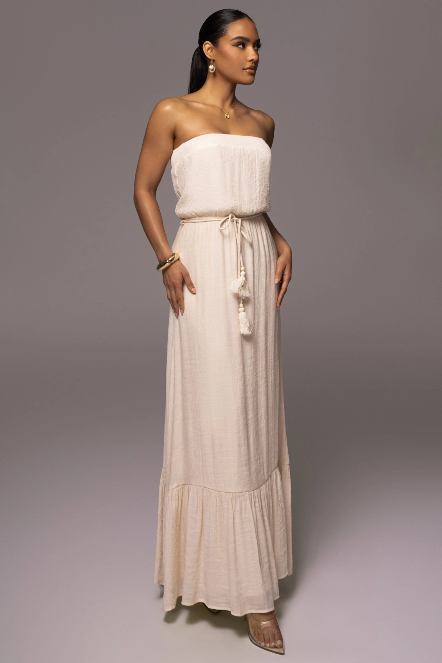 Introducing our new Beige Del Sol Linen Maxi Dress. Crafted in a linen blend, our latest maxi dress features a strapless neckline with a ruffle trim hem and an adjustable drawstring at the waist detailing tassel trims. Stretchy.