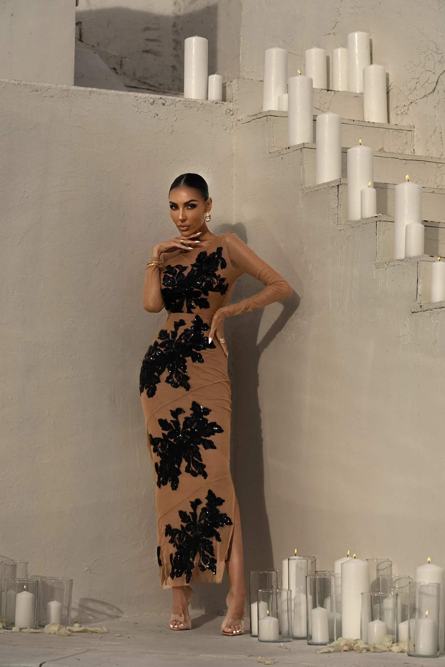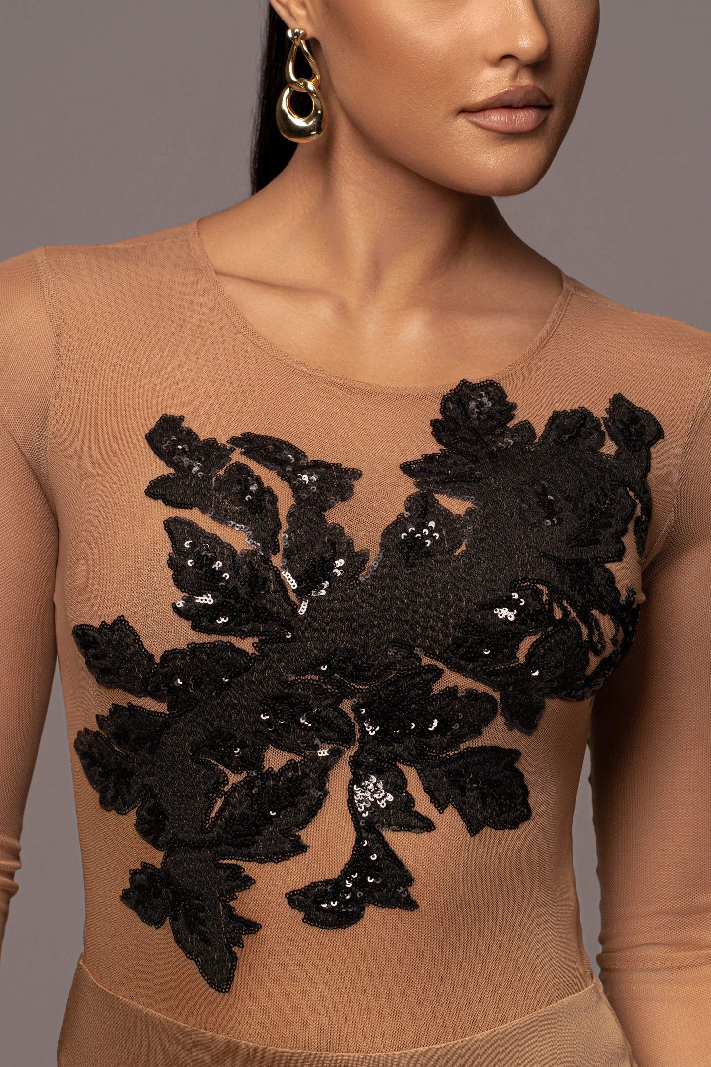 Stand out from the crowd in our Noir Charmed Embroidered Mesh Bodysuit. A stunning sheer mesh overlay embellished with delicate floral embroidery covers this gorgeous long sleeve bodysuit. The lower waist of this bodysuit is composed of a smooth doubled lined material for extra comfort. Thong back bottom with double snap closure. Pair with our