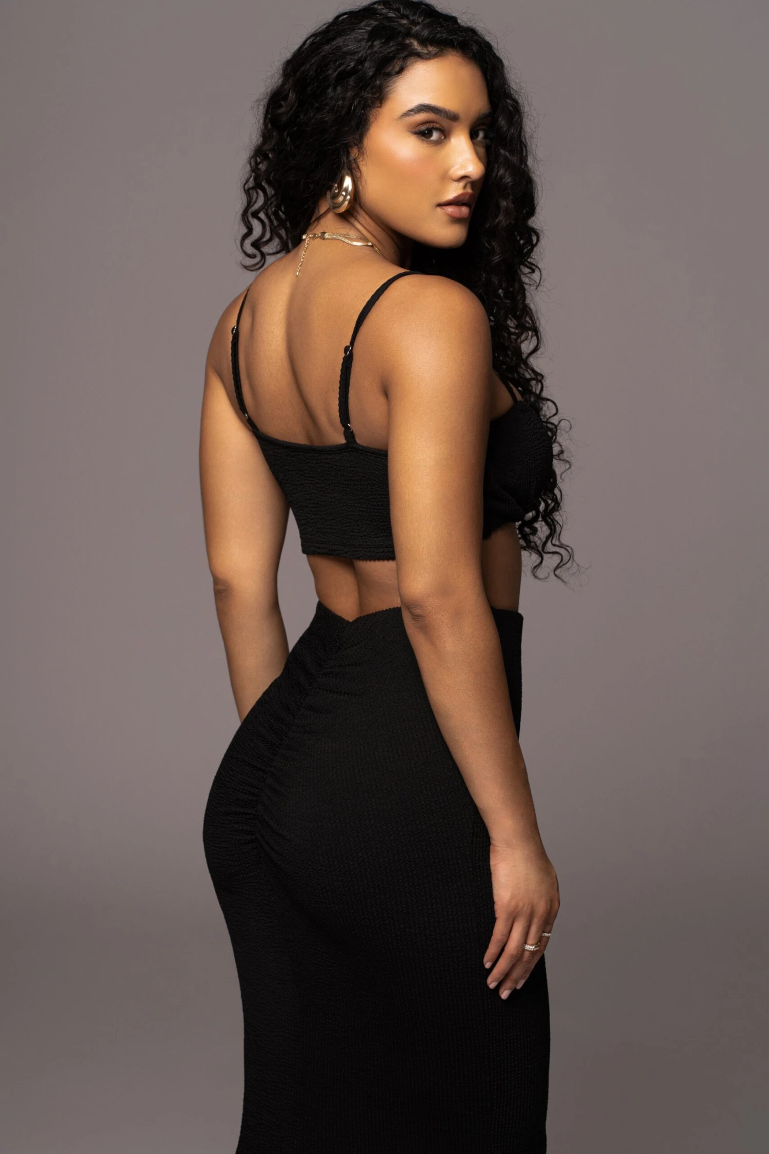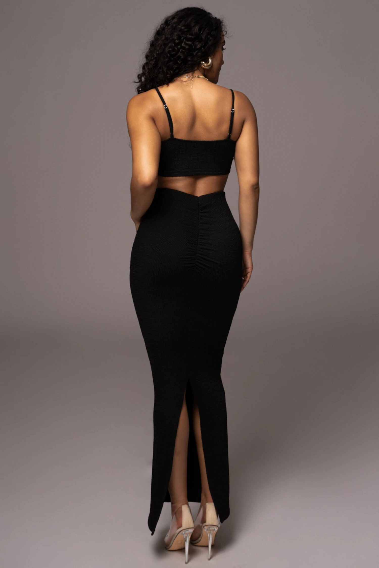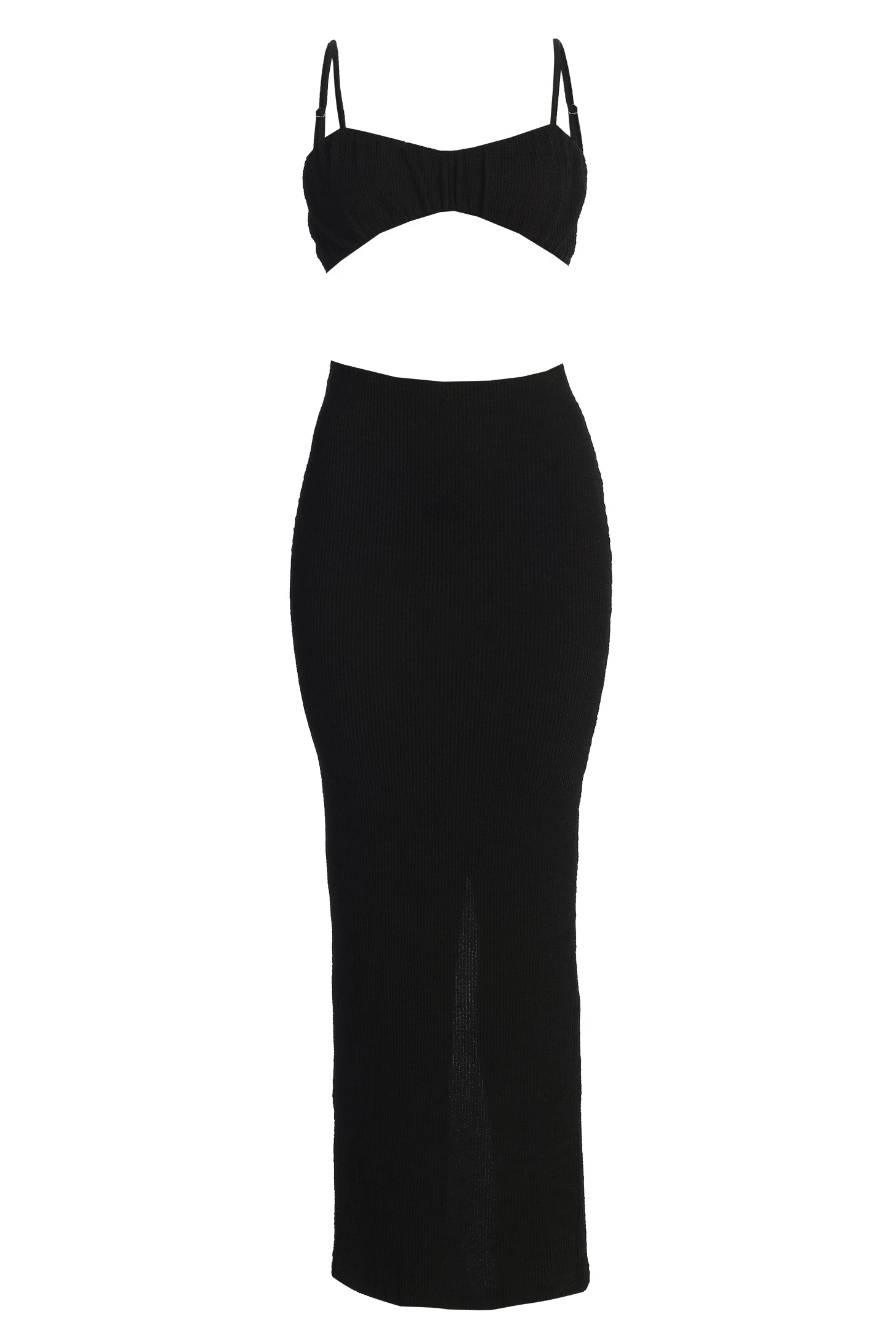 Our Black Fiji 2-Piece Skirt Set was made for Summer. This captivating two piece skirt set is designed in a smocked inspired fabric providing breathable comfort throughout the seasons. Featuring a bralette style top with adjustable shoulder straps while the matching skirt features an elastic waistband with fitted silhouette, back slit hem, and maxi hem. Single lined. Stretchy. Sold as set.