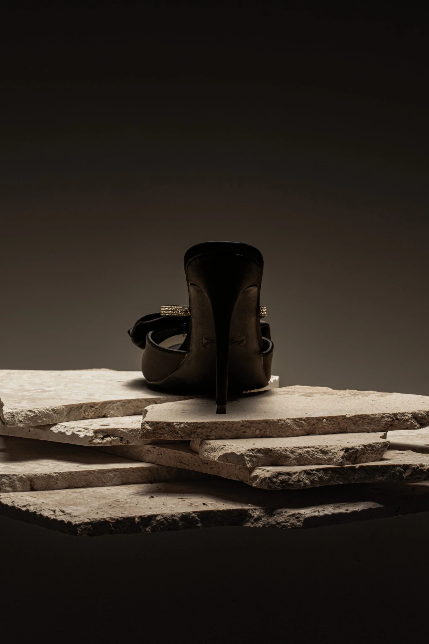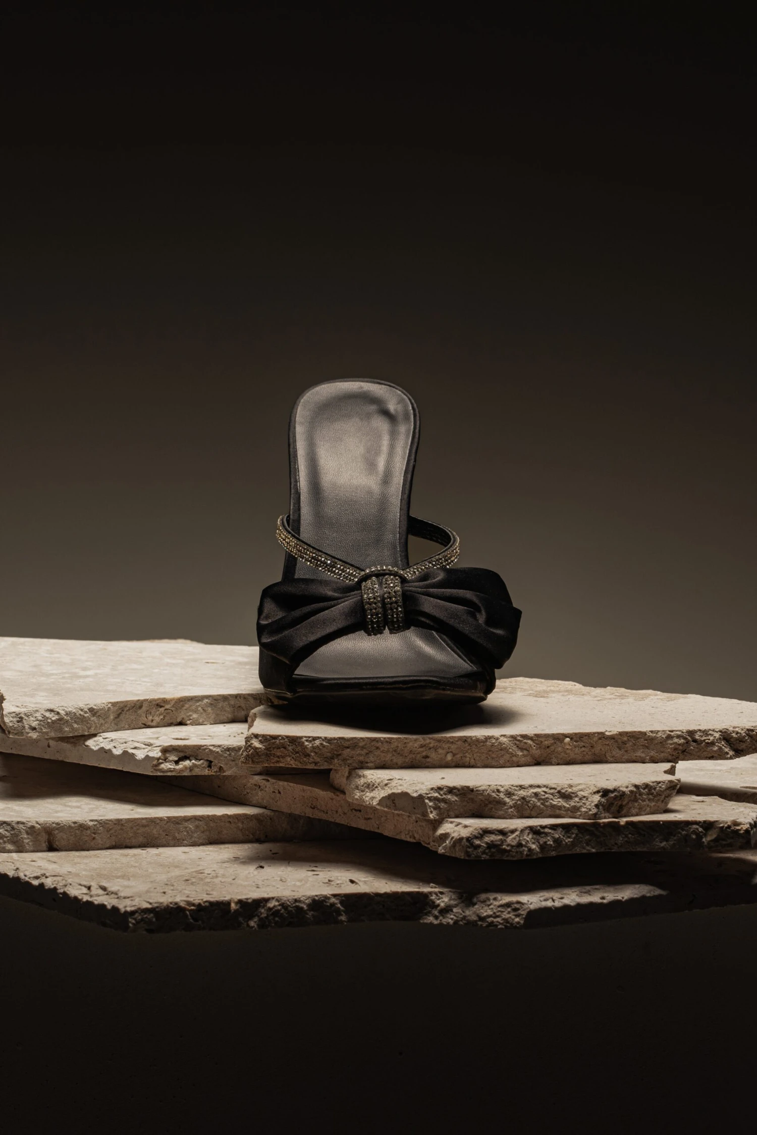 Match sparkle to your look with our Black Glimmer Of Sparkle Rhinestone Heels. Made in a high-shine satin fabric, these open point-toe heels feature a stunning center bow with dazzling embellished straps. Cushioned insole for comfort. Slide-on wear.