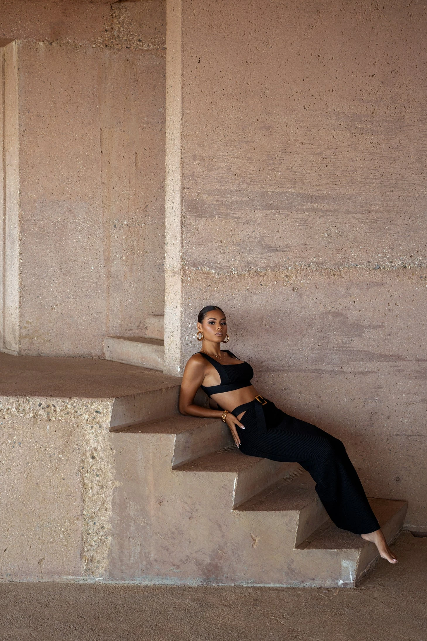 The Noir Nikole Ribbed Skirt Set is a match made in paradise! This form fitting skirt set features a lovely crop top cut with a squared neckline, fixed shoulder straps, and an open back detailing a squared bamboo buckle. The matching maxi skirt comes with a pencil silhouette, cut-out sides at the hip, and a squared bamboo buckle. Stretchy. Split back hem. Sold as set.