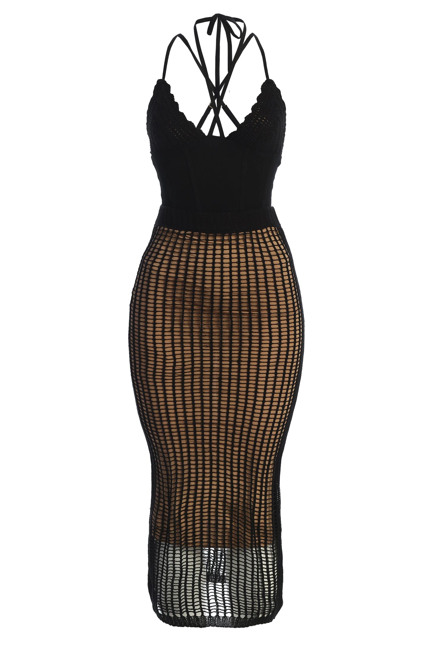At the top of our list for vacation favorites is our Noir Summer Bliss Crochet Set. This skirt set features a fully lined bodysuit with low v-neckline, adjustable shoulder straps, and stylish crisscross neck ties. Bodysuit comes with a fitted bodice detailing boned seams and a thong back with snap closures. The matching skirt features an elastic waistband with nude interior lining and a midi-length hem. Stretchy. Sold as set.
