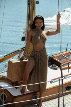Channel the goddess in you with our Brown Linen Sahara Dress. This appealing drape design features a crossover halter-neck with center cutout and a captivating side slit with wrap front ties draping down the middle. Designed in double lined linen fabric with a smocked back for a flexible fit. Some stretch.