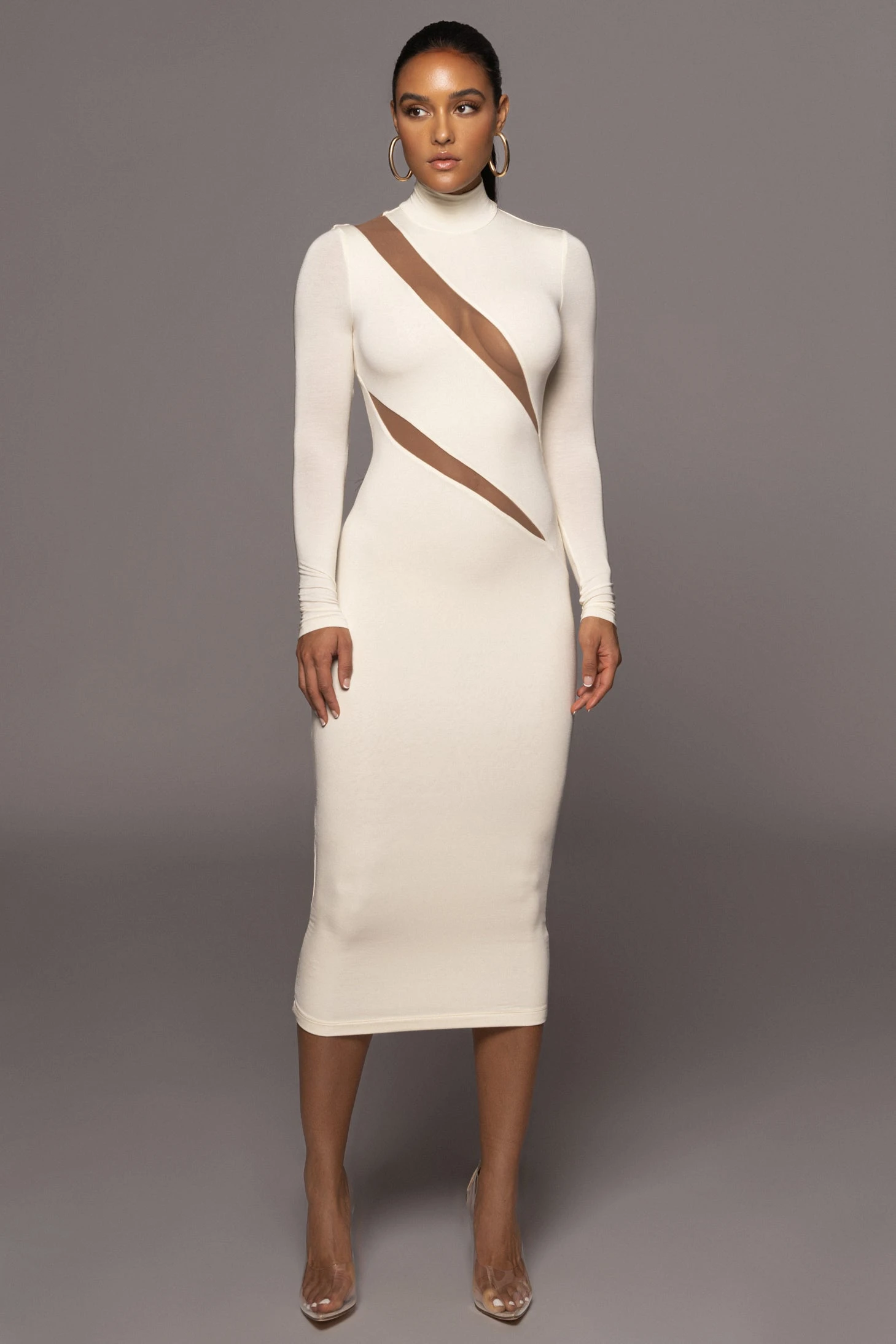 Steal the spotlight every time in the Buttercream Abigail Midi Dress. Crafted in a mix of mesh and soft jersey, this long sleeve mock neck dress is designed with stylish mesh panels in a modern asymmetrical pattern across the front/back bodice. Stretchy. Double lined.