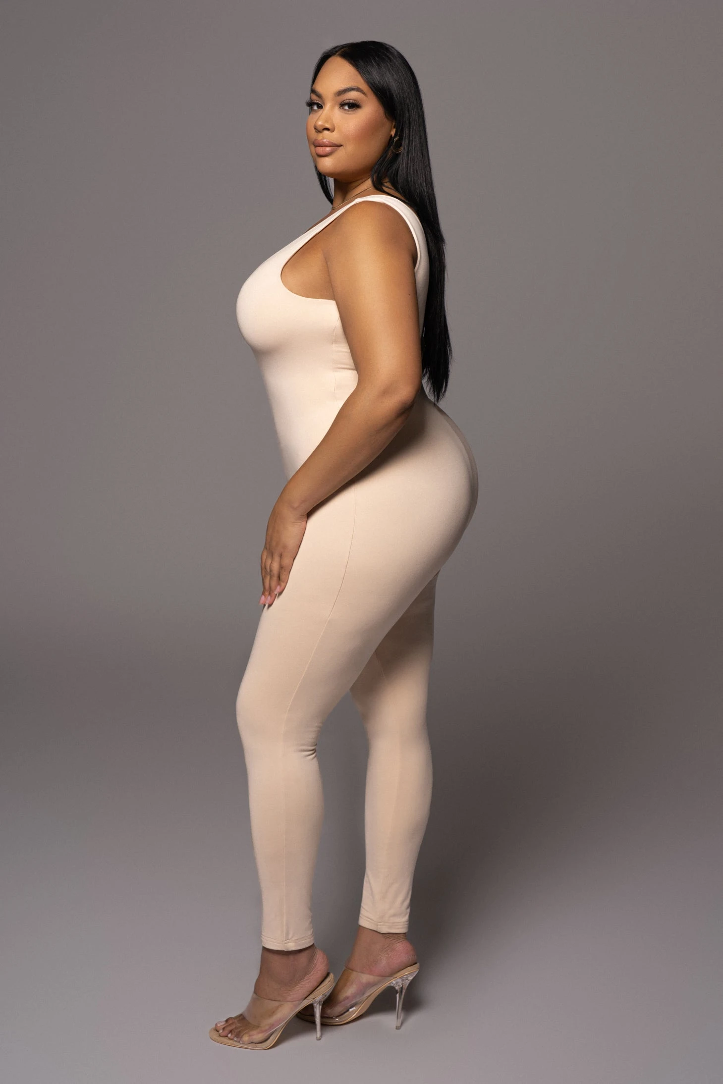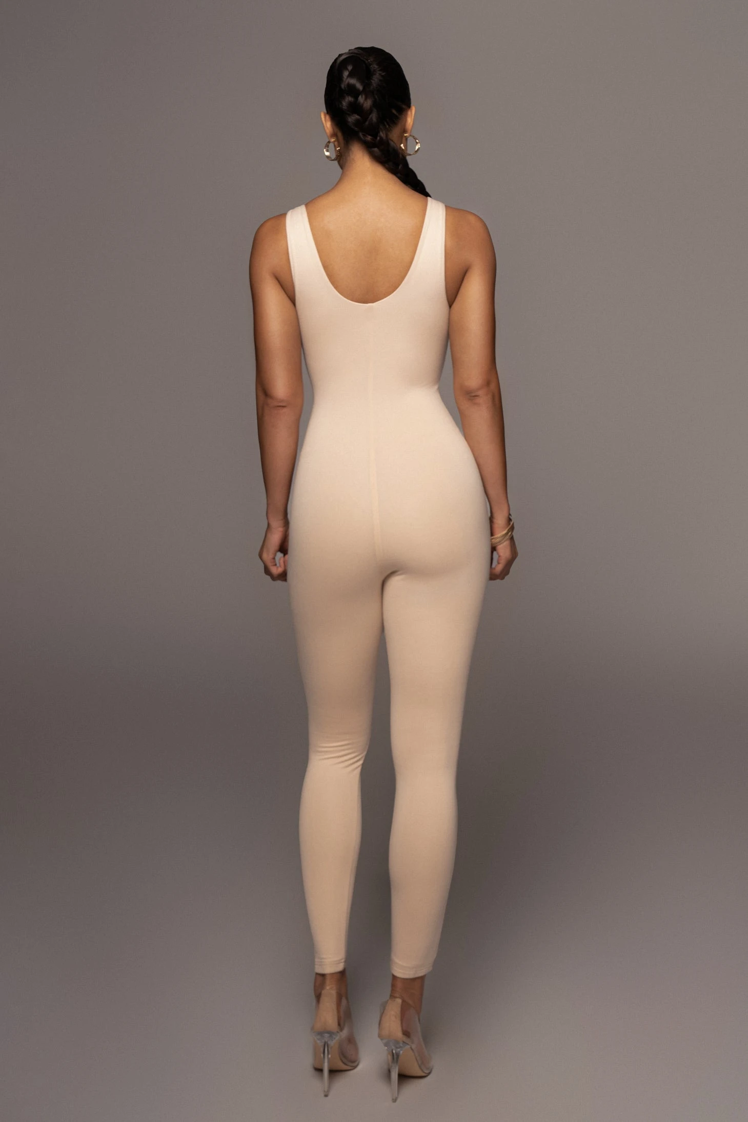 EXCLUSIVELY DESIGNED BY US FOR YOU. All eyes are on you when out in the CREAM ALO DOUBLE LAYER JUMPSUIT! This versatile, sleeveless jumpsuit features a body forming silhouette with a low scoop neck, tank shoulders, and skinny leg hems. Designed in smooth double lined jersey fabric for compression support. Style it as a layer or by itself, either way, your look will be irresistible! Stretchy.