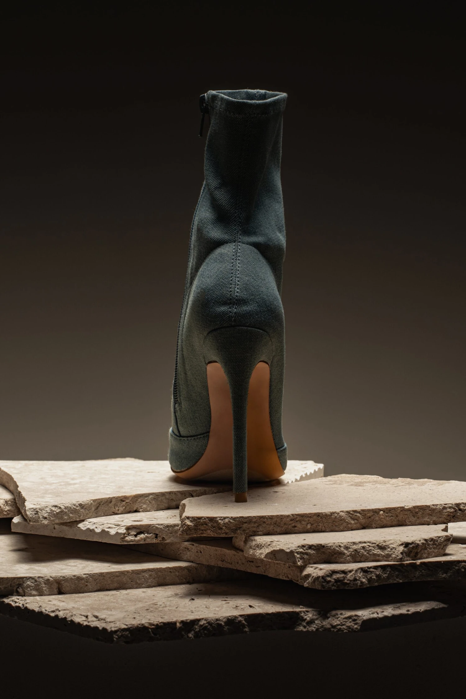 EXCLUSIVELY DESIGNED BY US FOR YOU. Achieve a head to toe denim look in our new DENIM ALTER EGO BOOTS! Featured in a denim inspired fabric that brings polish and style, this modern pair of heeled boots are complete with an interior side zipper closure, a pointed toe, and flirty stiletto heels. Just right and in time for the season! Metal hardware zipper.