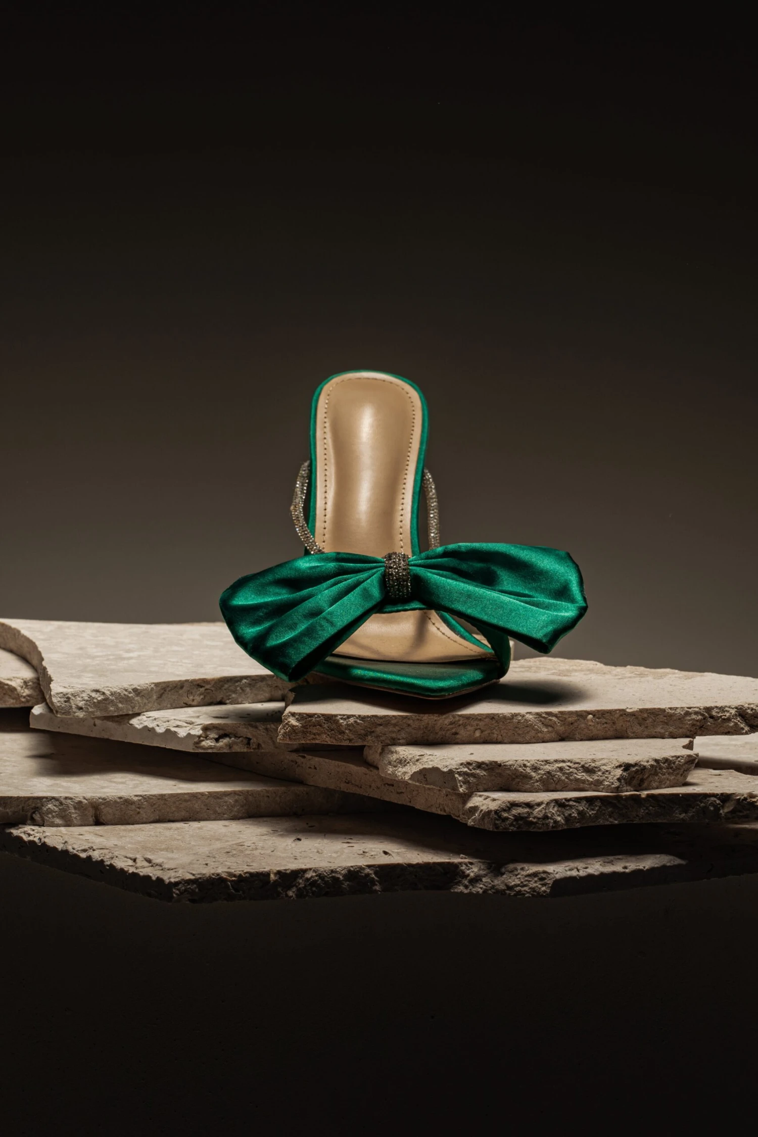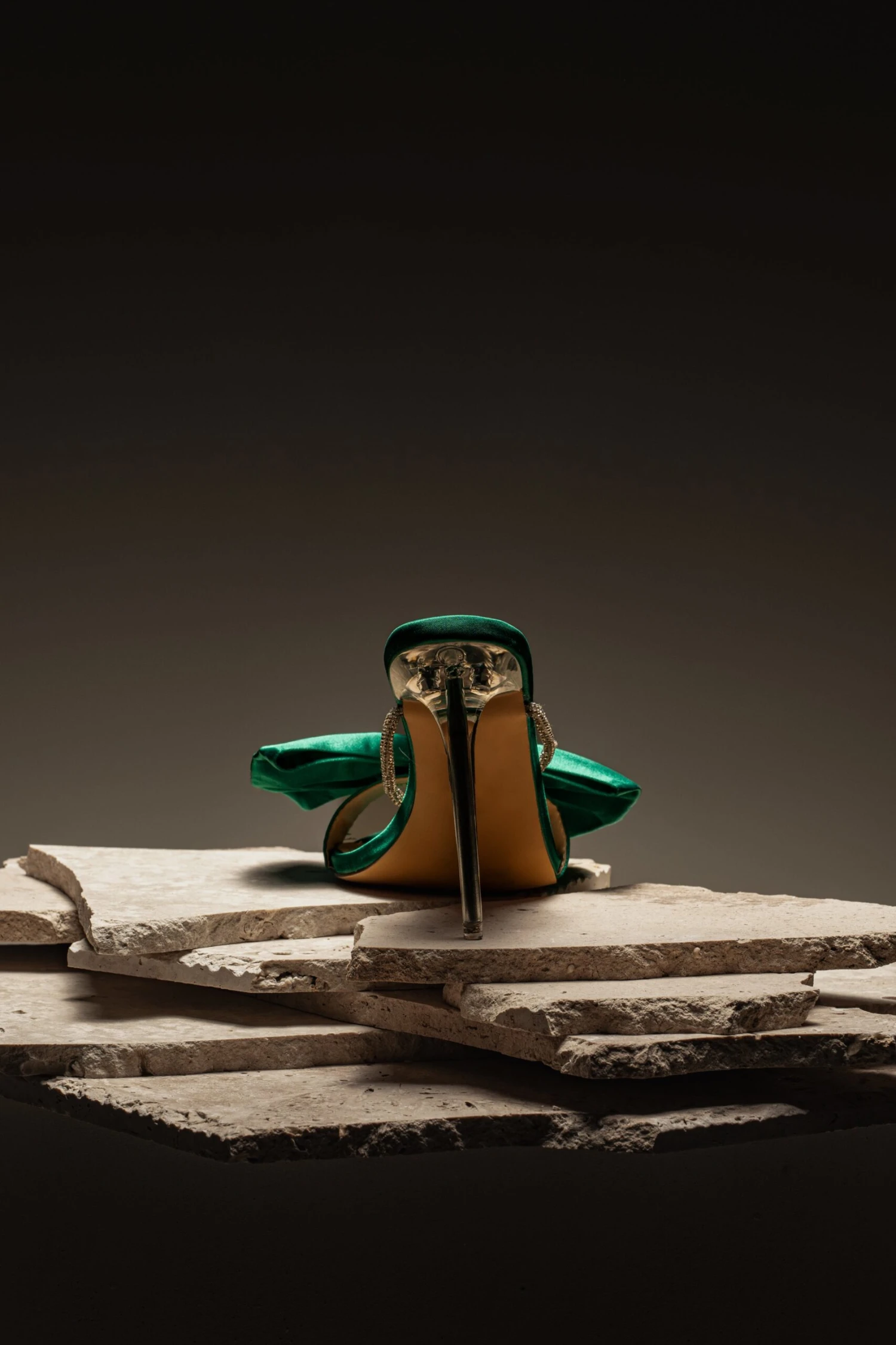 Add gorgeous sparkle to your days with the Emerald Shimmer And Shine Rhinestone Heels. Designed in a high-shine satin fabric, these point-toe heels feature a slip-on style with a center bow design and stunning rhinestone-embellished straps. Cushioned insole for comfort.