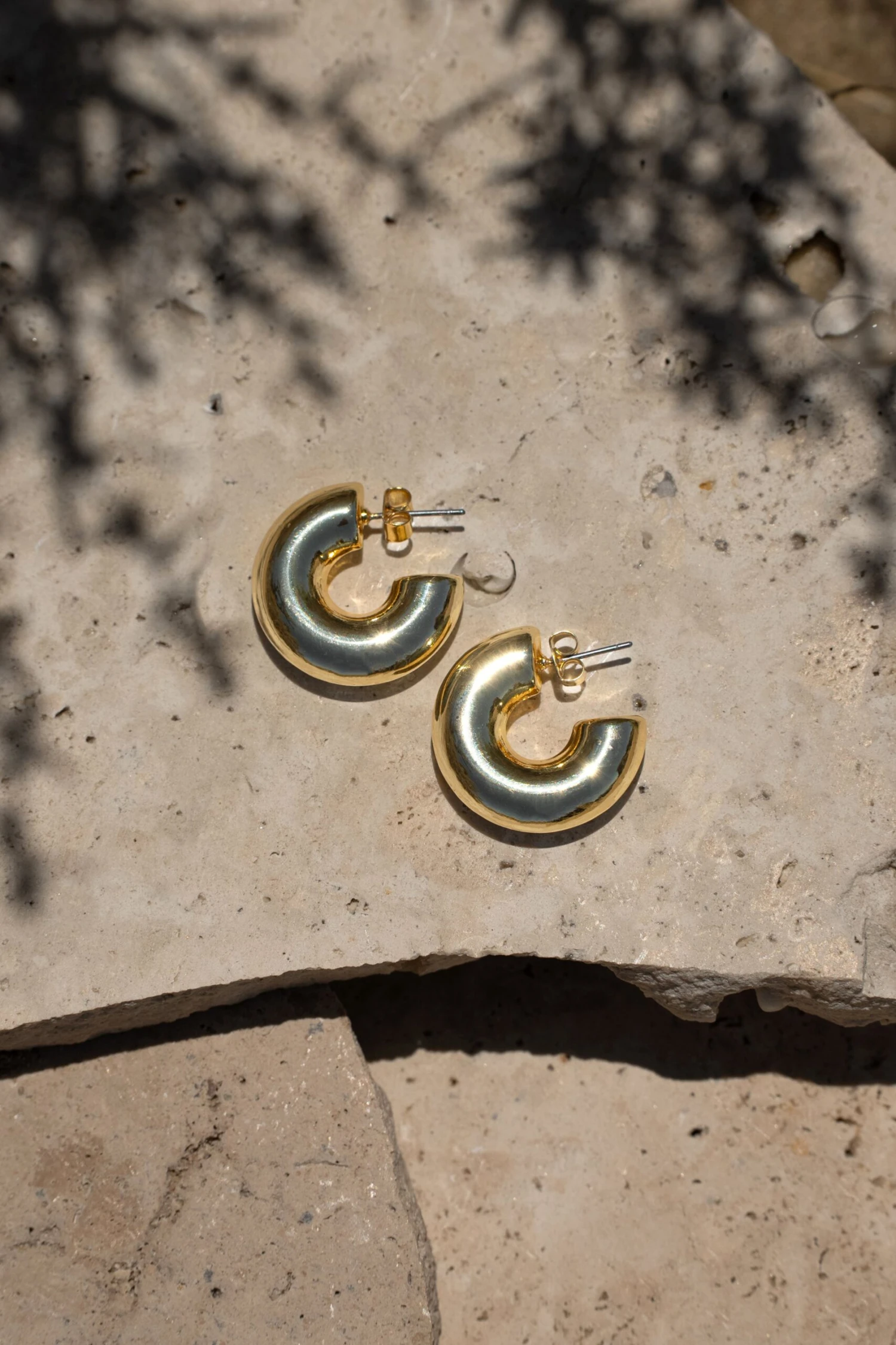 Adorn yourself with the shimmering glamour of the Gold Carolyn Earrings. These chunky open hoop earrings are constructed in a gold tone finish for a radiant shine all around. Push back closure.