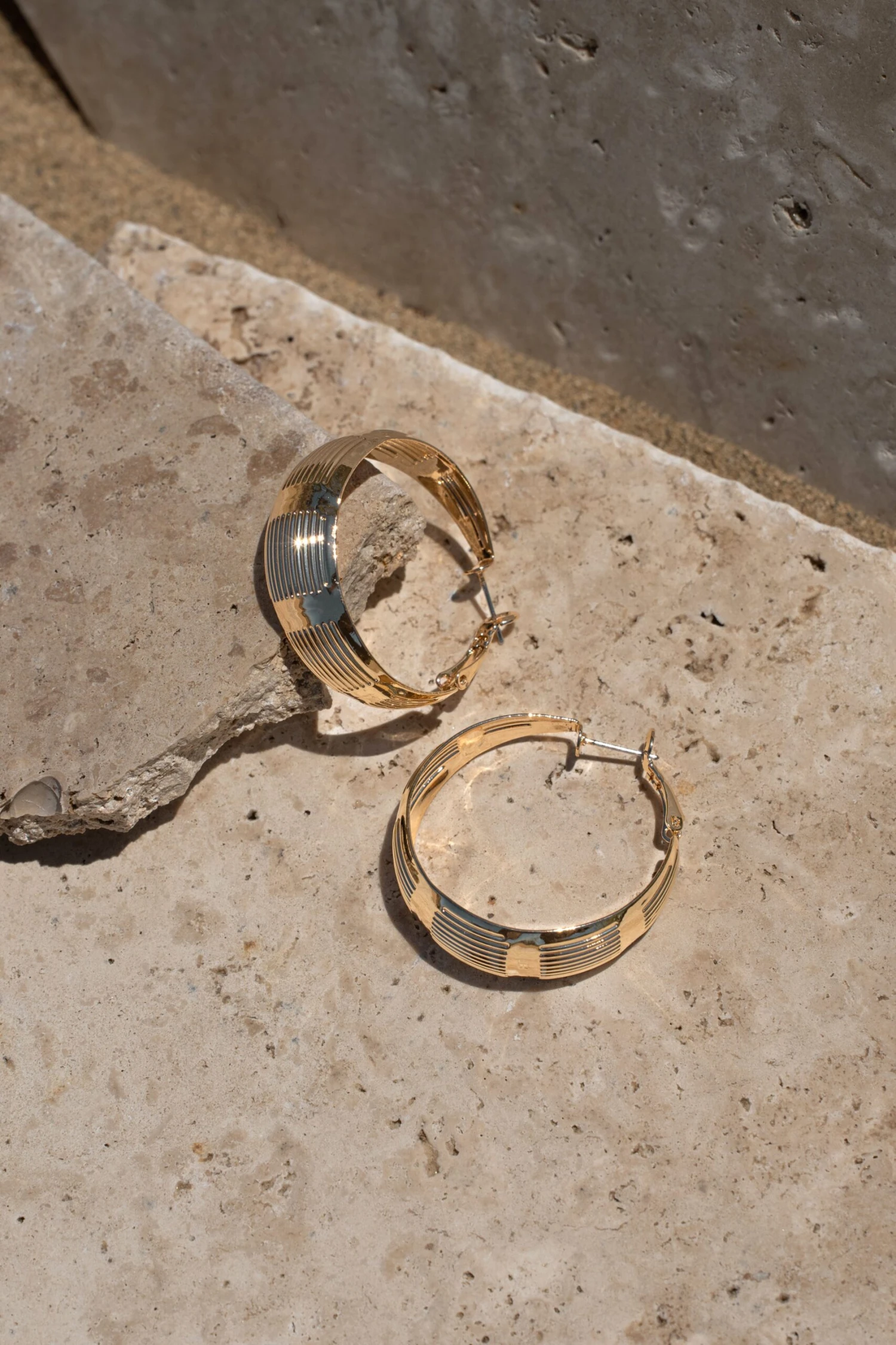 Our Gold Stelia Hoop Earrings elevate classic elegance in a pair of mid-size hoops featuring a gold-tone finish with latch-back closure.