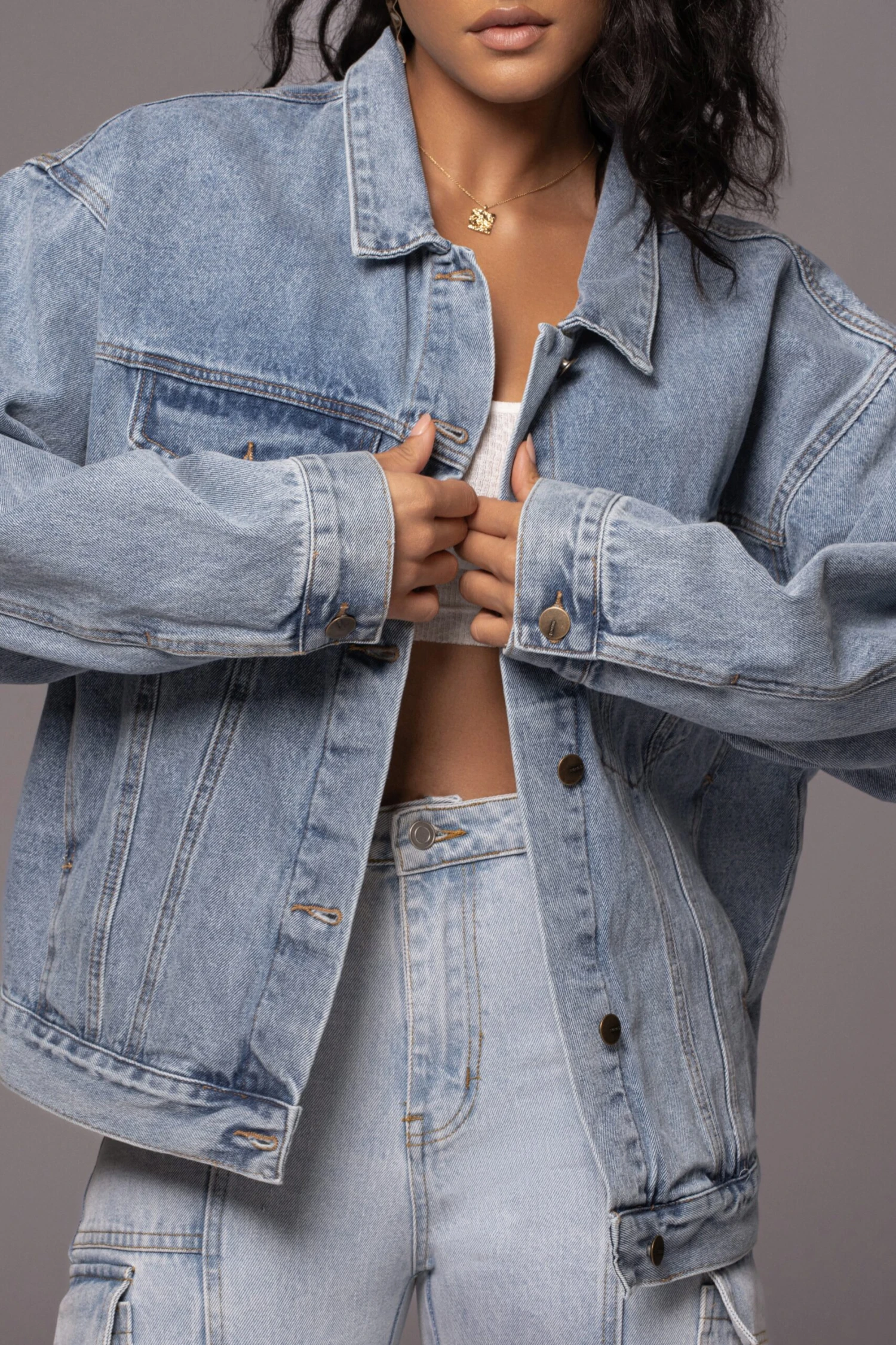 Add a classic touch to your look with our Medium Wash Denim Highlands Oversized Jacket. Featured in a oversized fit, this classic denim jacket comes with a collared neckline, chest/hand pockets, a button front closure and roll-up sleeves with buttoned cuffs. Minimal stretch.Â