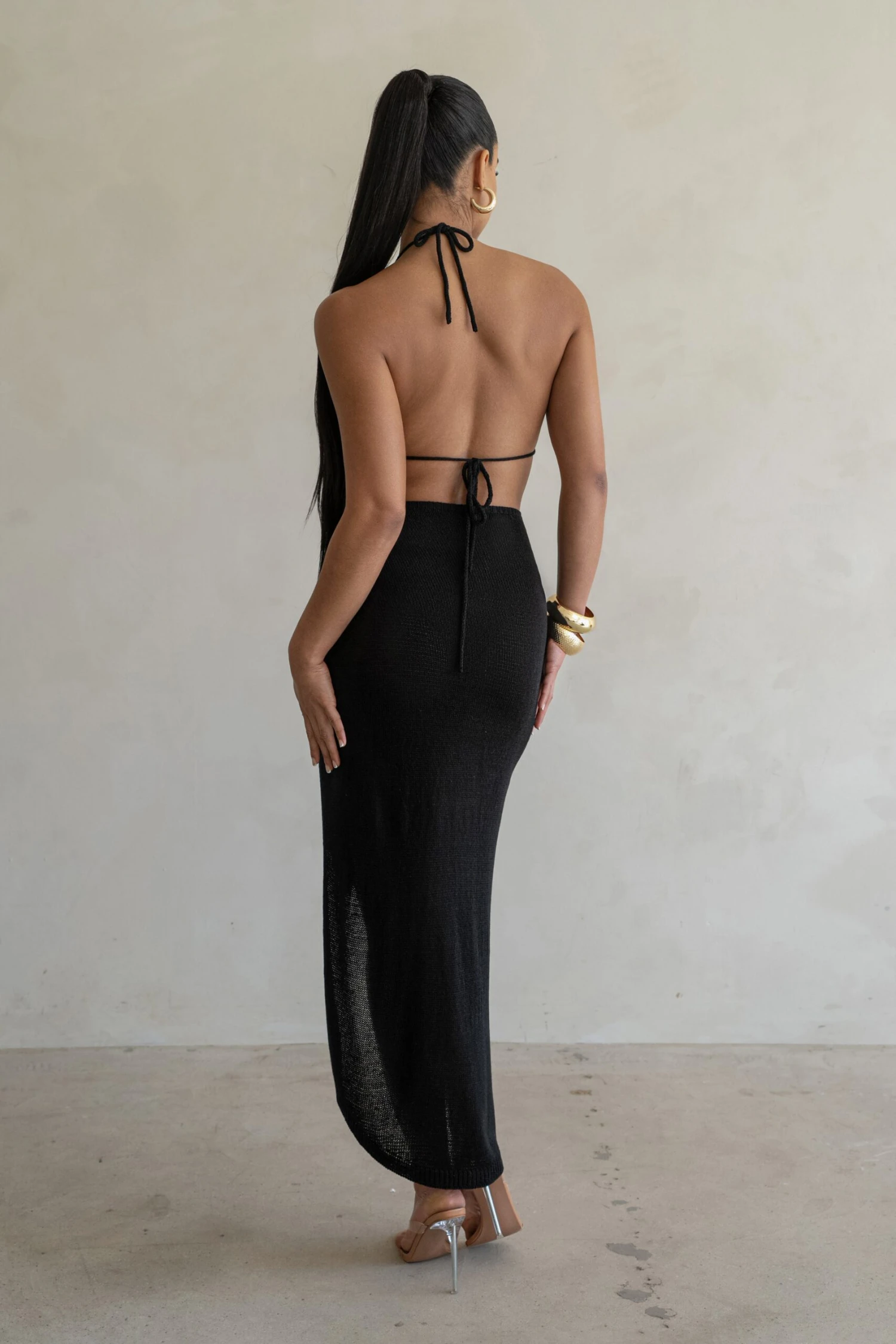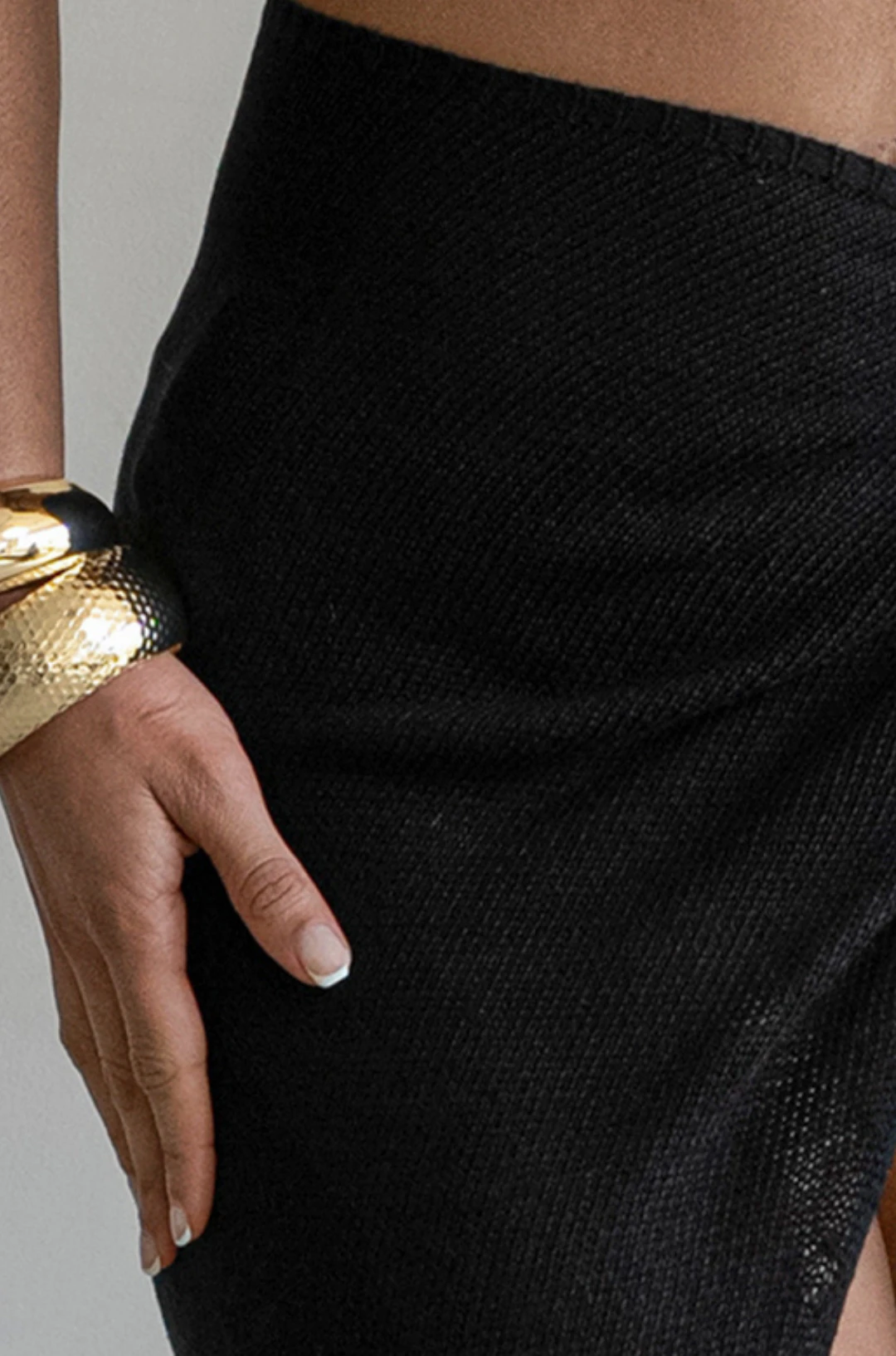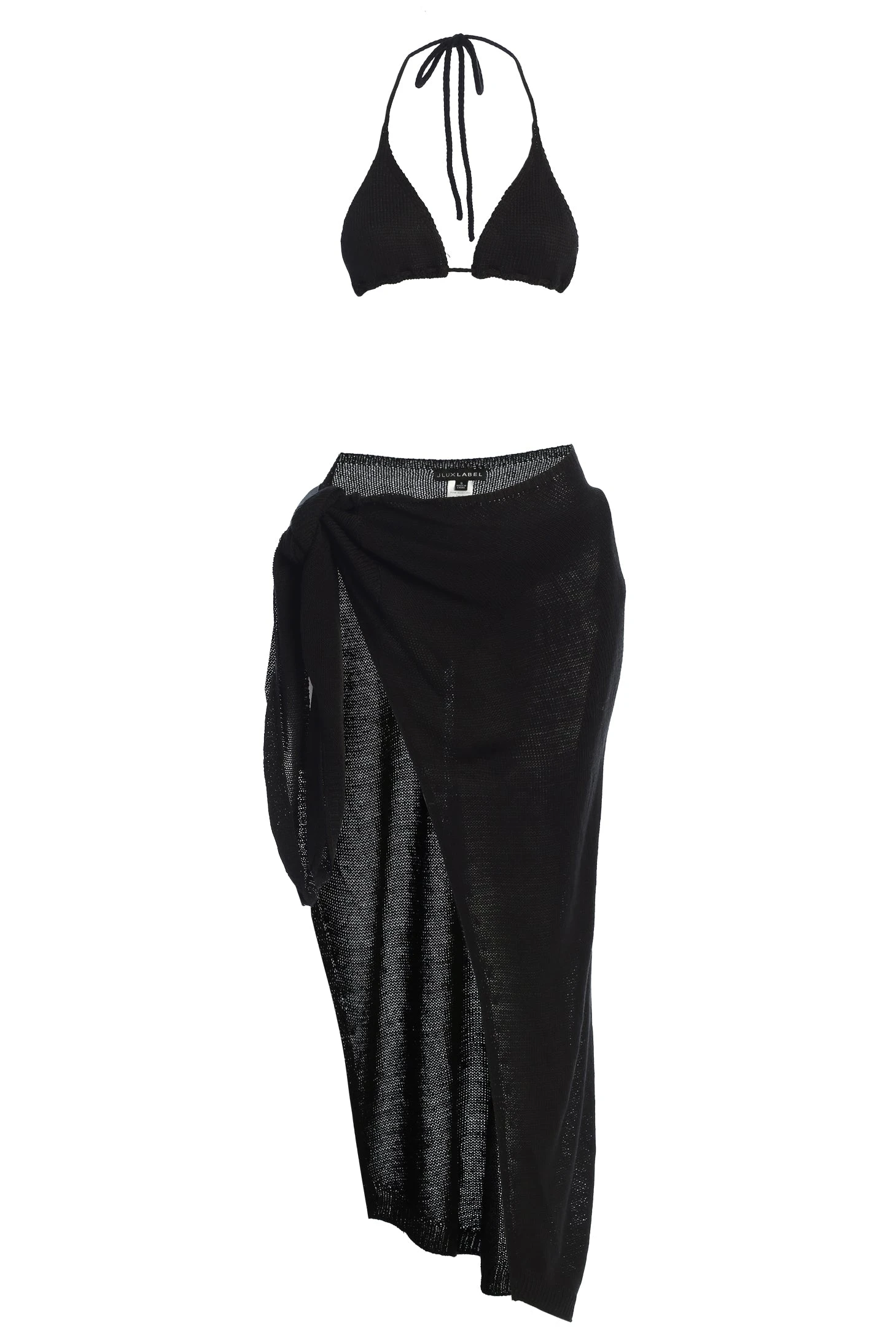Upgrade your resort wear with our Noir Hidden Oasis Bikini Set. Designed in crocheted knit, this all-in-one 3-piece bikini set features a sultry triangle top with string neck/back ties and matching bottoms with a high leg cut and tie string closure on both sides. Complete with a sarong to top off the look, this lounge set is destined for laying seaside. Stretchy. Sold as set.