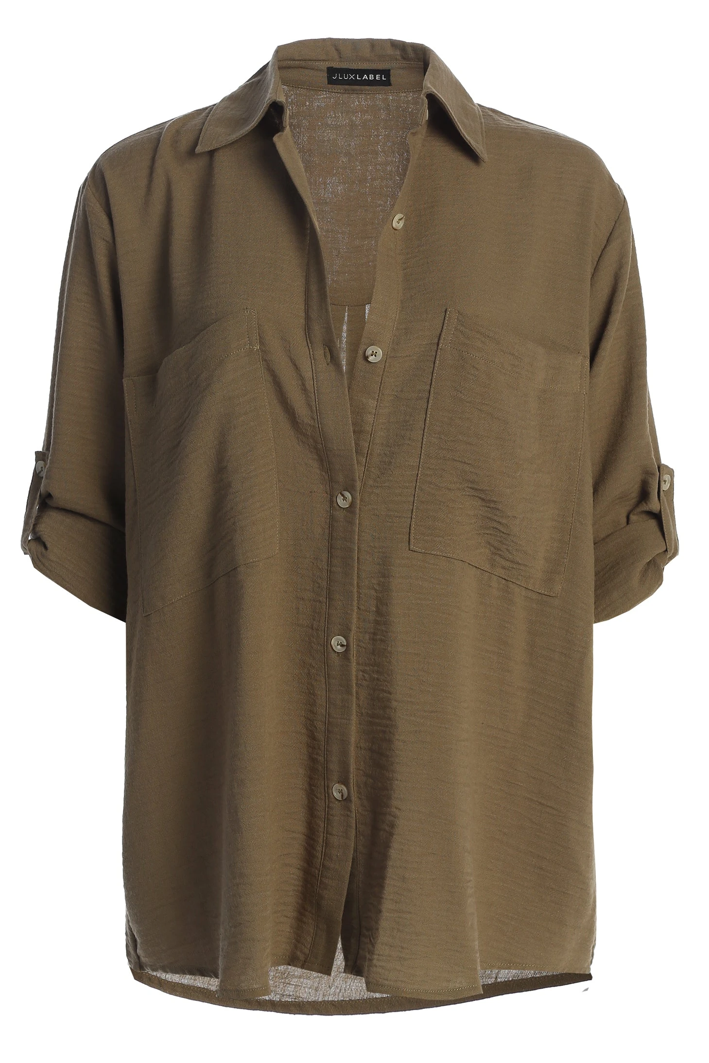 Set your style free in our Olive By The Coast Crinkled Button Up. This button up top features a collared neckline with long sleeve arms, two welt pockets, and roll up cuffs. Designed in a charming lightweight linen blend for a fresh feeling finish! Minimal Stretch. Single lined.