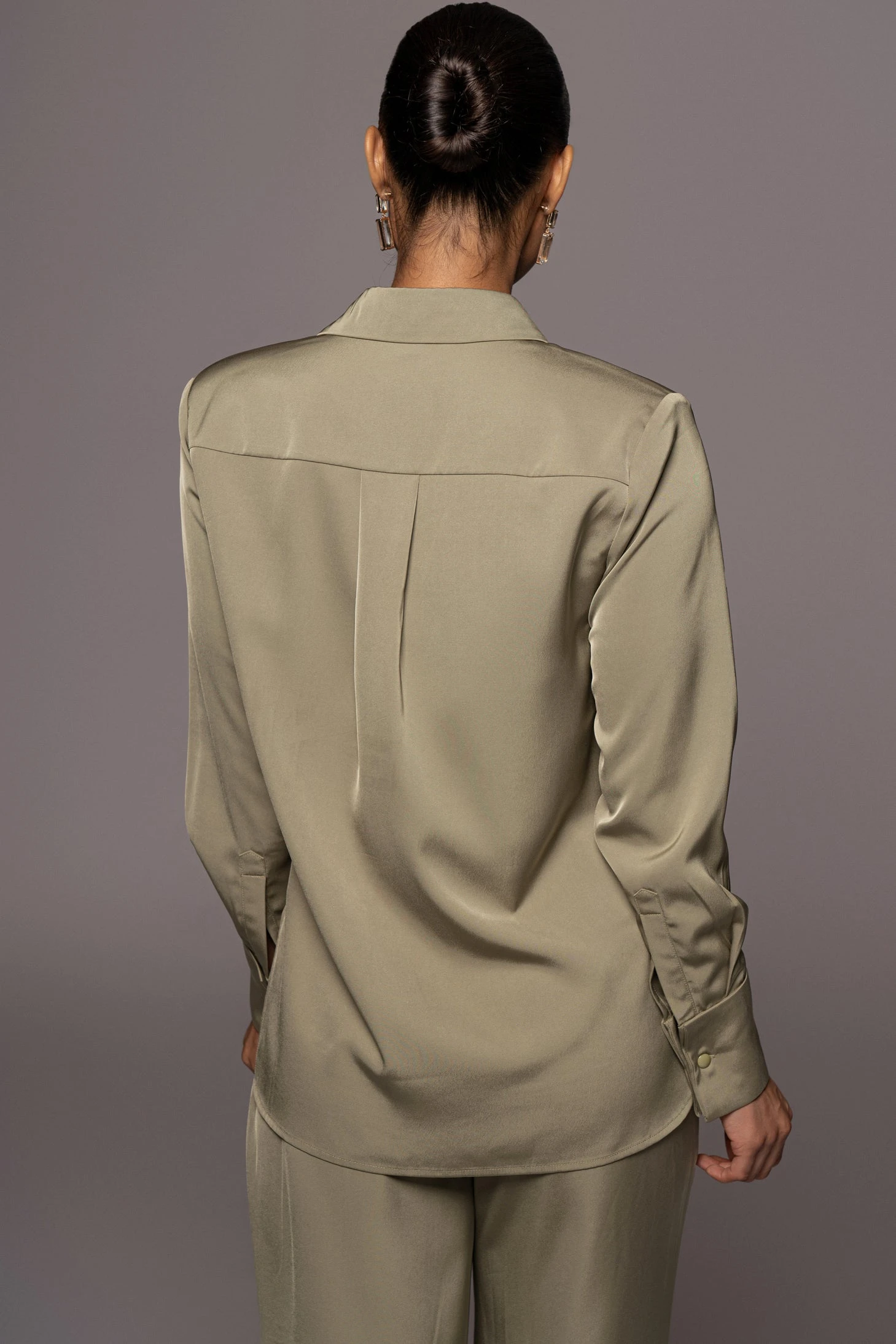 Keep it classic and chic with our Olive Misty Button Up. This collared neck long sleeve top comes in a classic fit with two functional flap pockets and a button down front with button detailed cuffs. Style this sophisticated top tucked in for a workday look or wear tucked out on a day off for a casual approach. Coordinate the full look with our