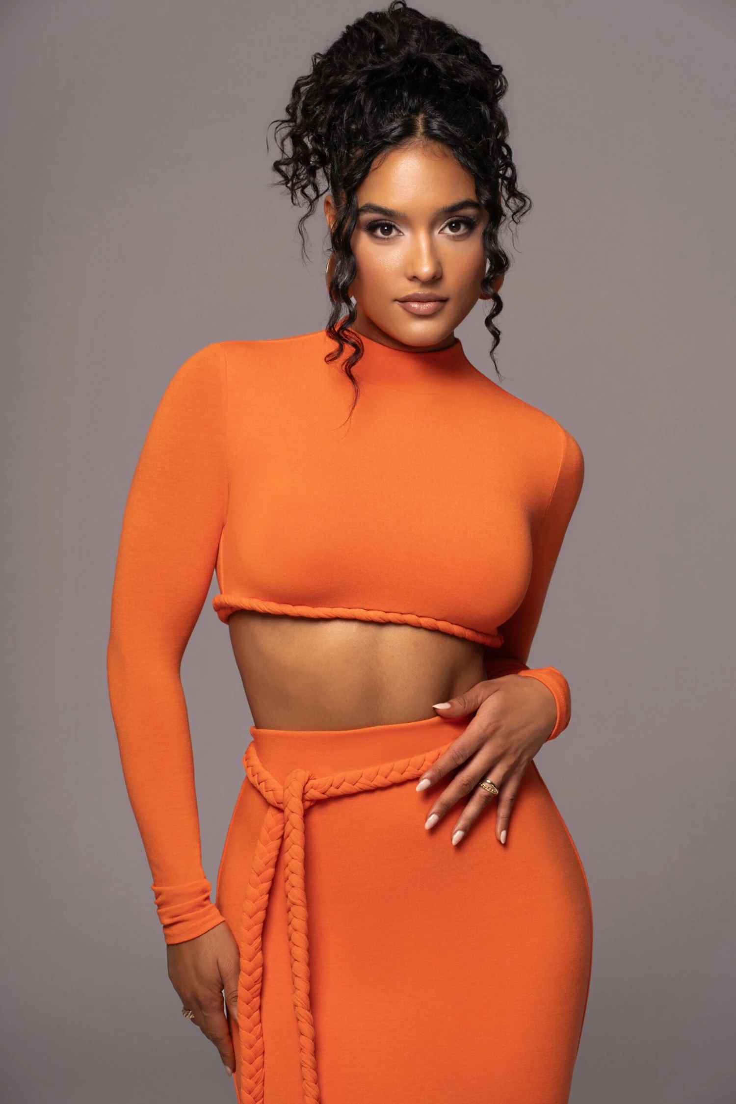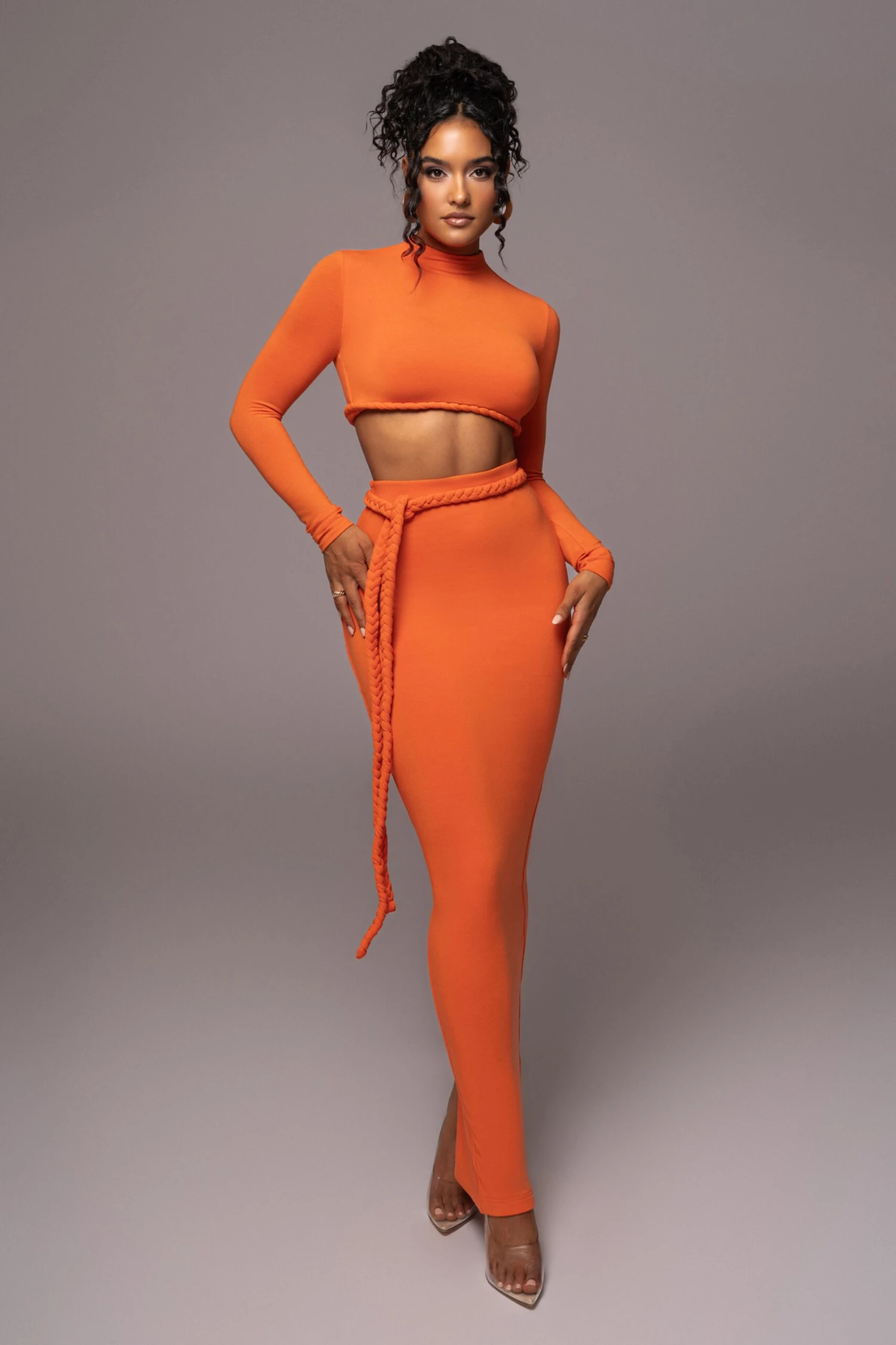 Achieve summer perfection with our Orange City Love Two-Piece Skirt Set. This must-have set features a long sleeve top adorned with a braided hem. The matching skirt features a fitted silhouette with an elastic waistband and a beautifully braided waist belt. Crafted in smooth double lined material with extra stretch for comfort and fit. Sold as set.