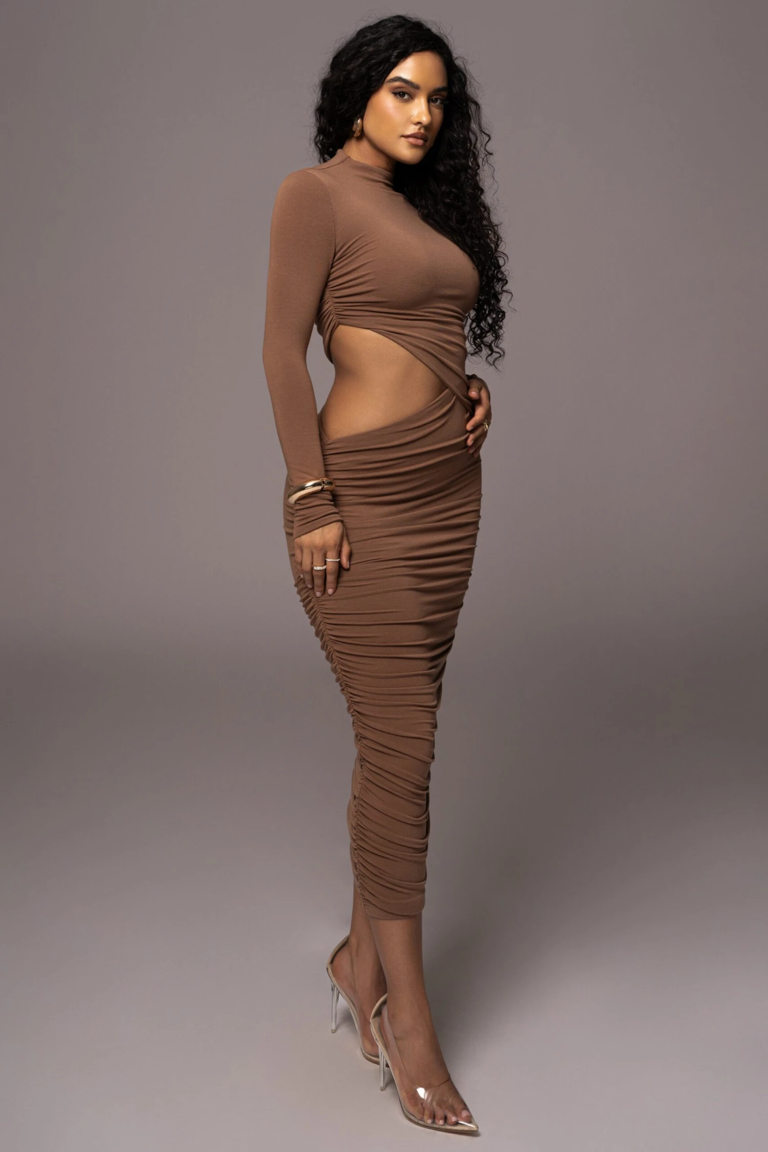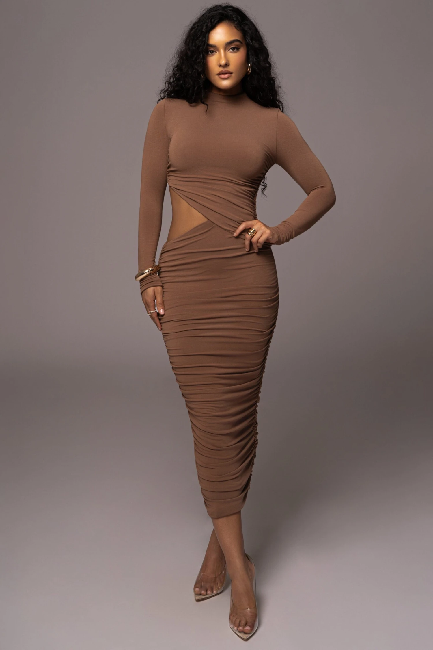 Introducing our Pecan Clear Skies Mock Neck Dress – an embodiment of refined elegance. This versatile midi dress features a mock neckline, long sleeves arms, and a stylish asymmetrical cutout located towards the right waist. Flattering ruching throughout gracefully elevates this piece with texture. Stretchy. Double-lined.