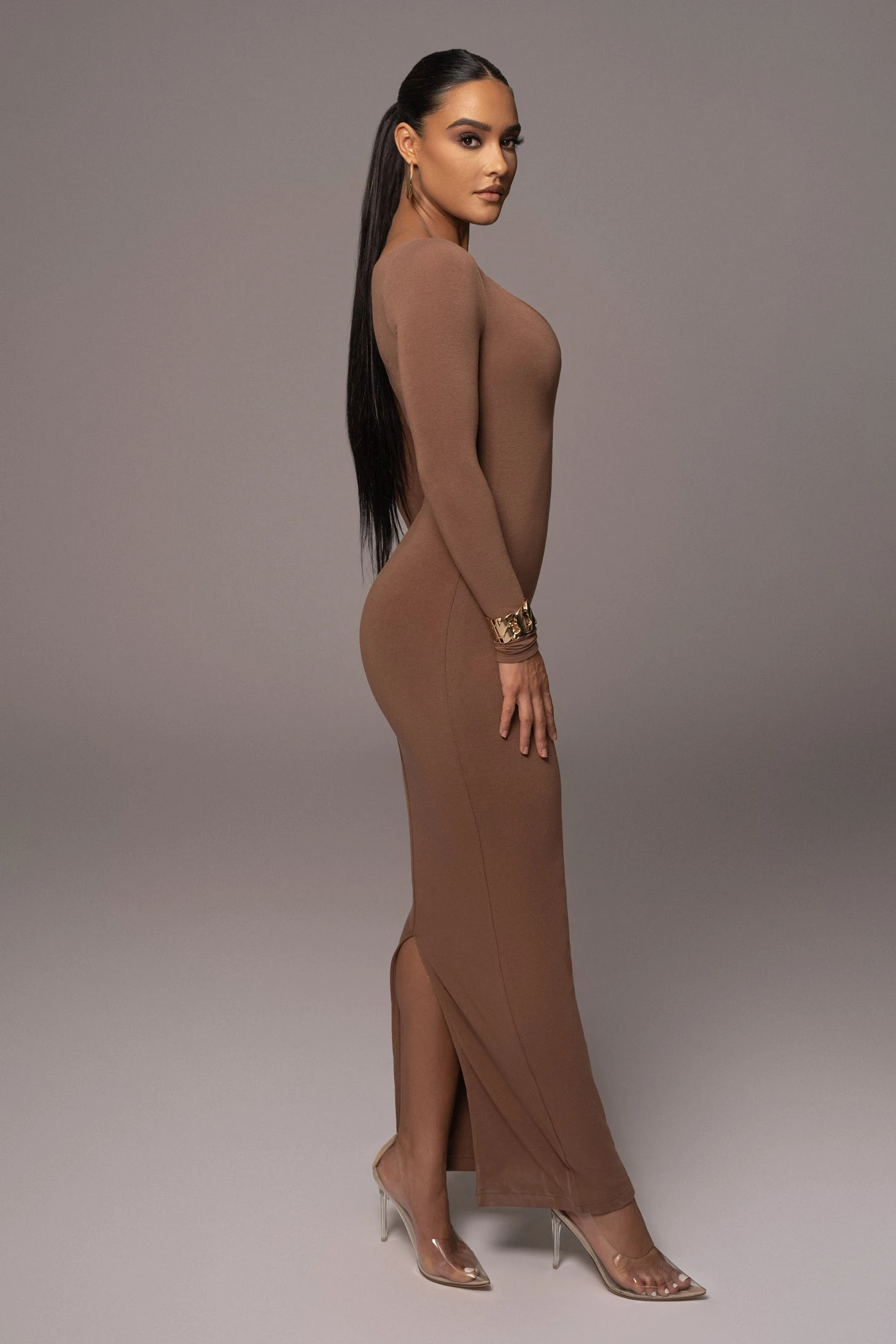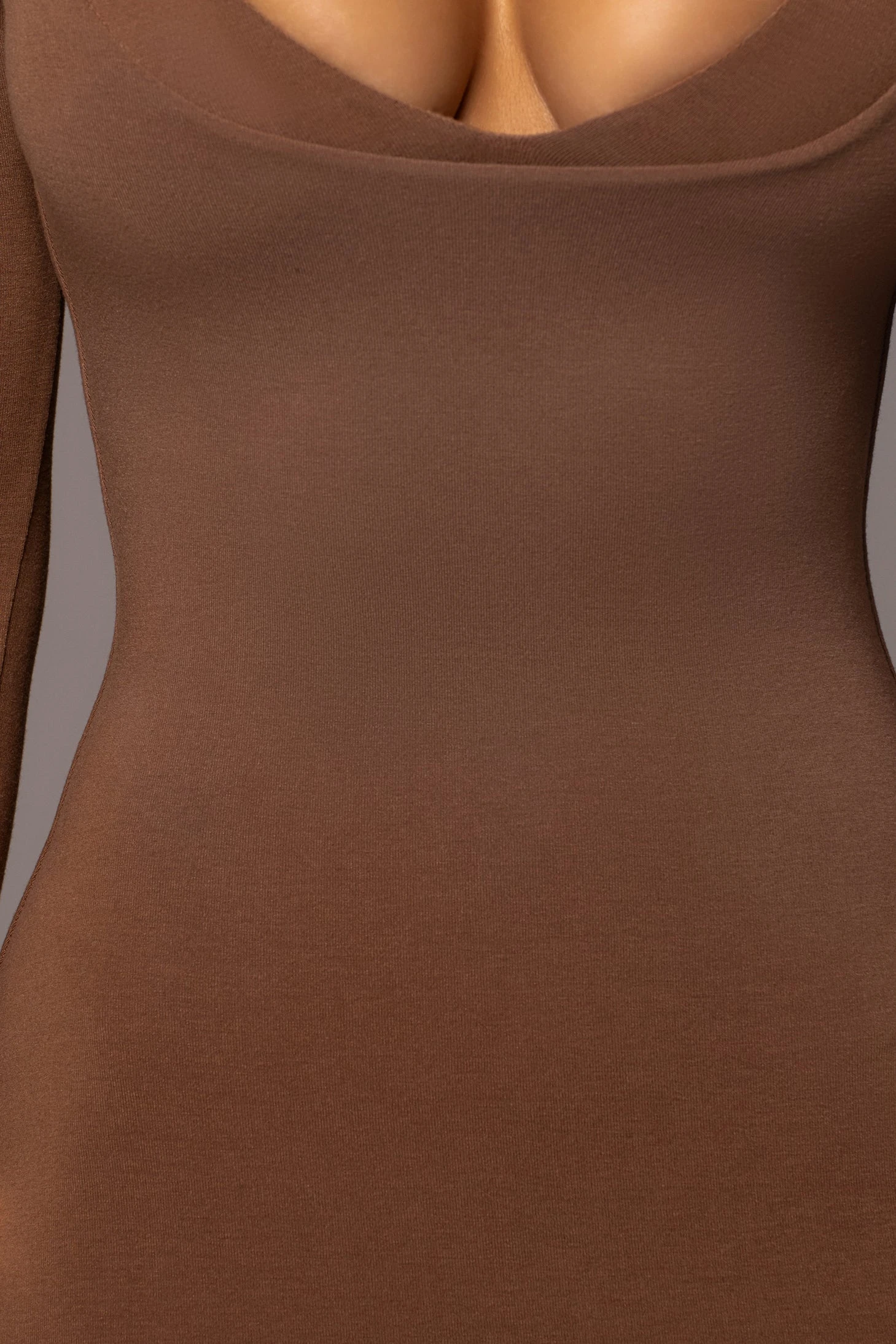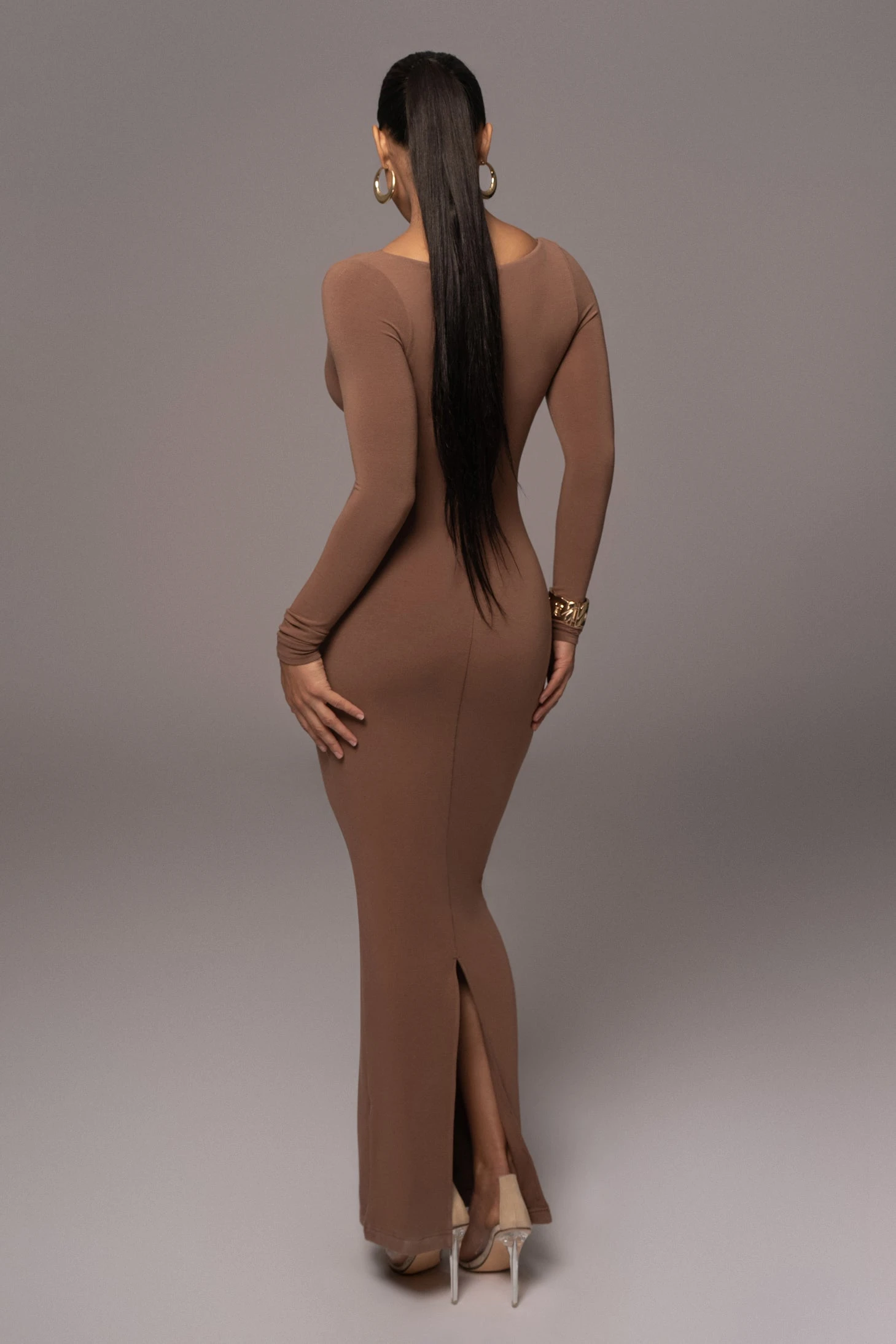 Achieve the perfect blend of classic with a touch of modern in our new Pecan Made You Look Maxi Dress. This gorgeous combo dress features a triangle bra top layered under a smooth, soft maxi dress with long-sleeves in a sleek body-con silhouette. Adjustable straps. Double lined with stretch.
