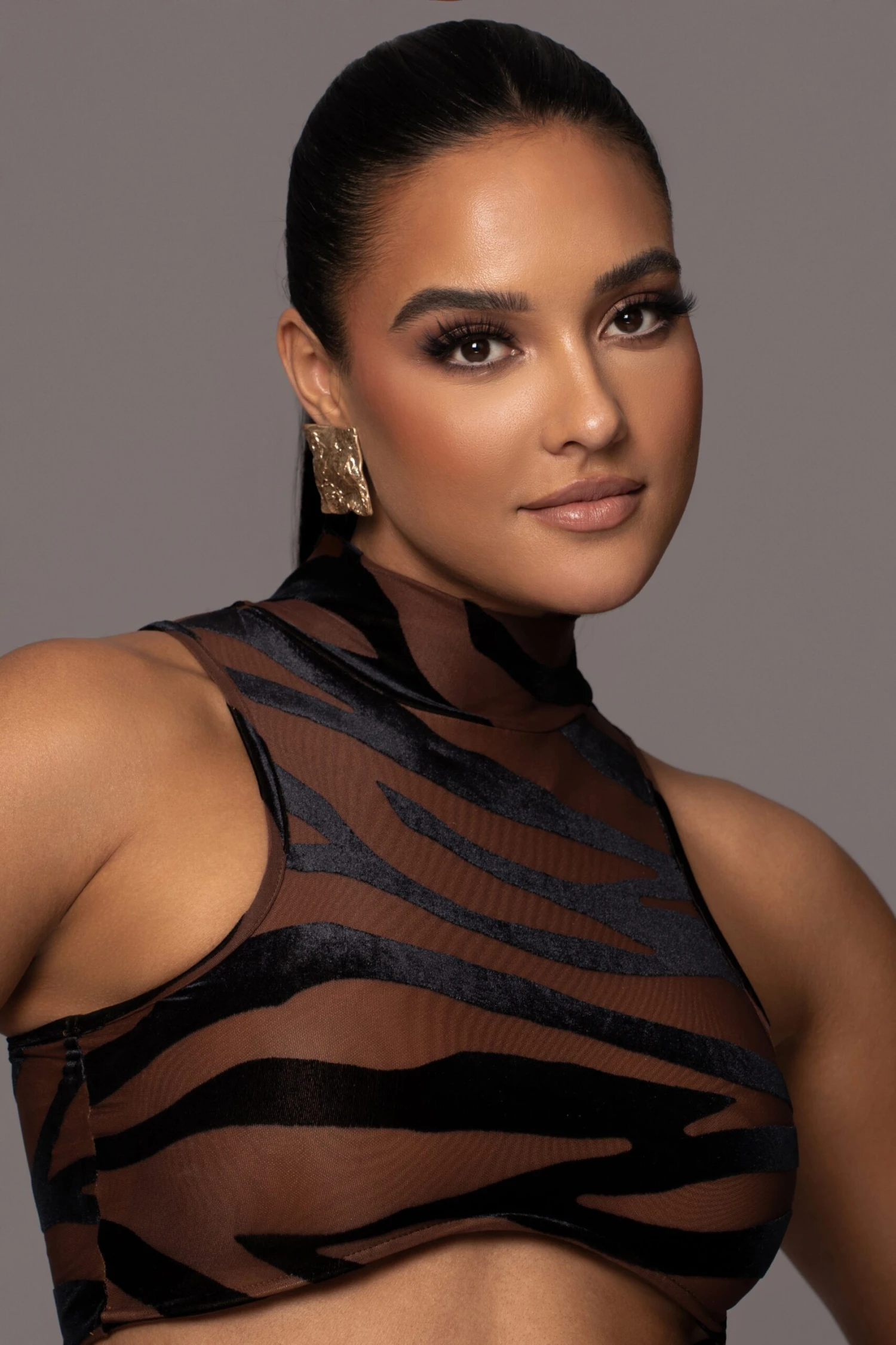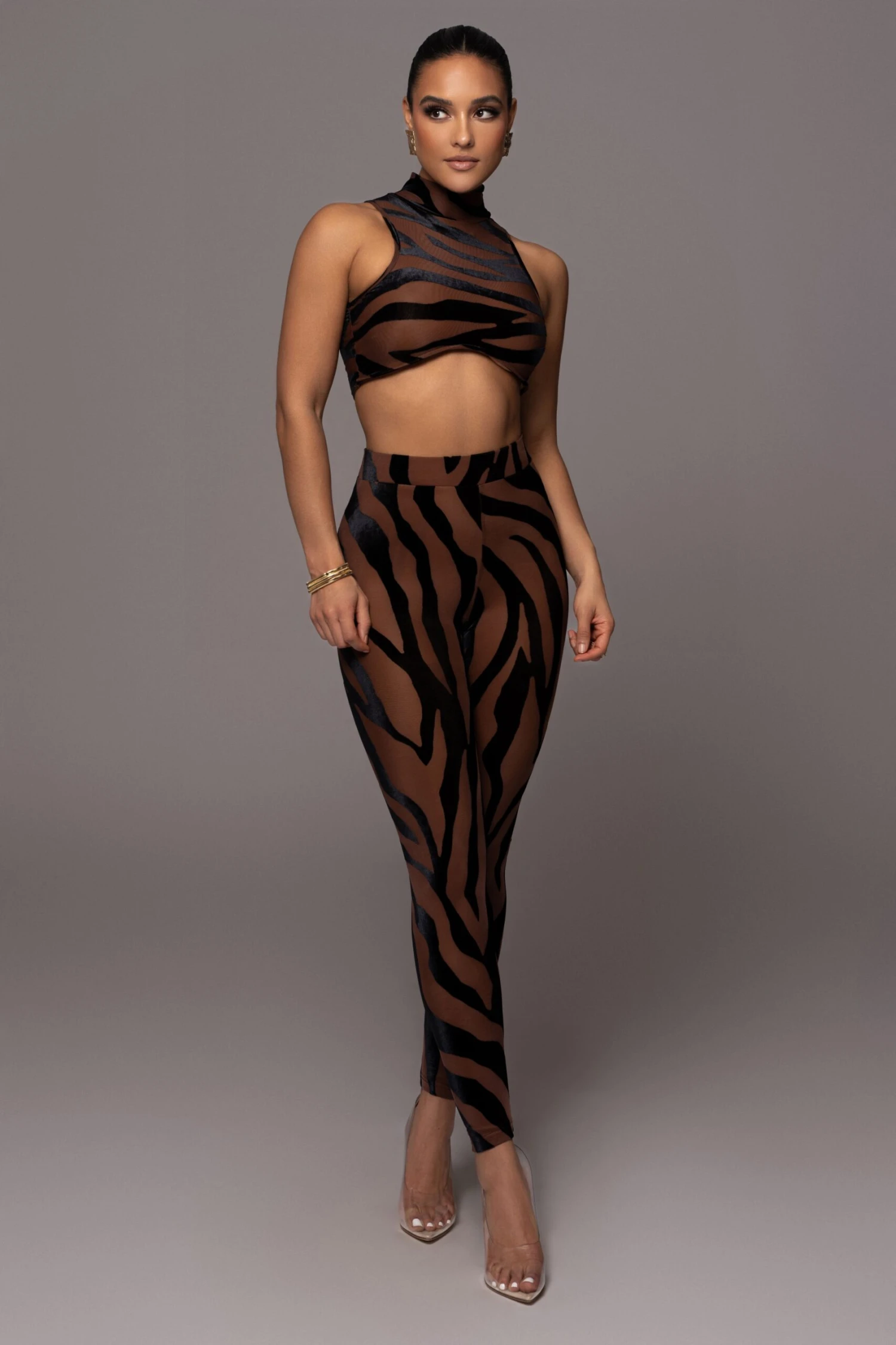Tap into your wild side with the Pecan Never Phased Crop Top. This playful crop top features a mock neckline with sleeveless shoulders and a curved cropped hem. Designed in a modern zebra-print burnout fabric with nude interior lining creating sensual illusions of transparency. Pair with our