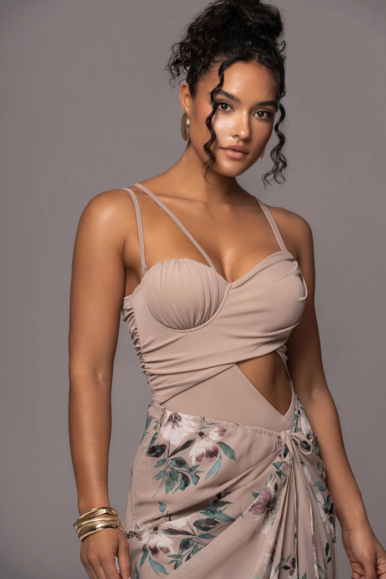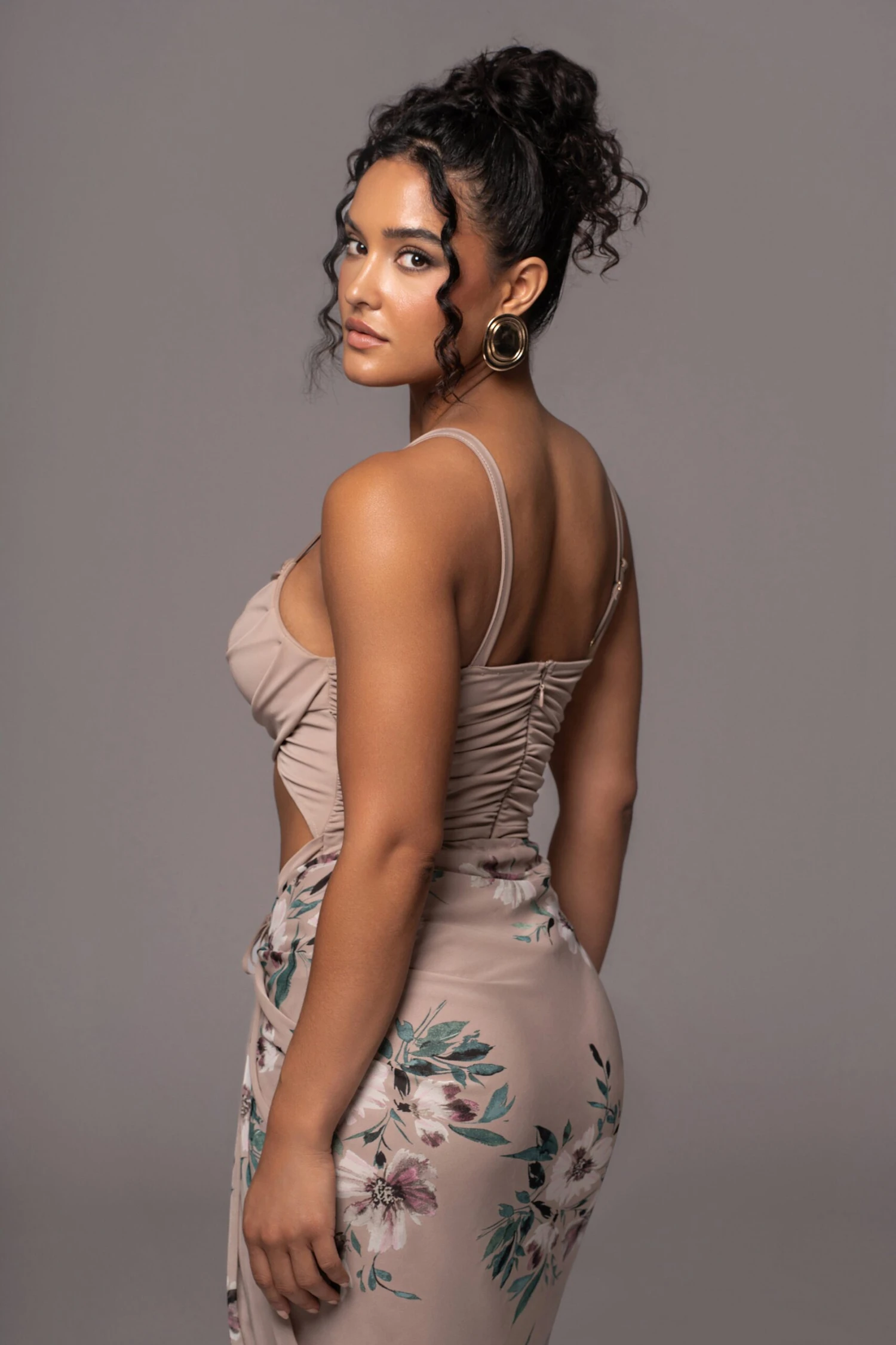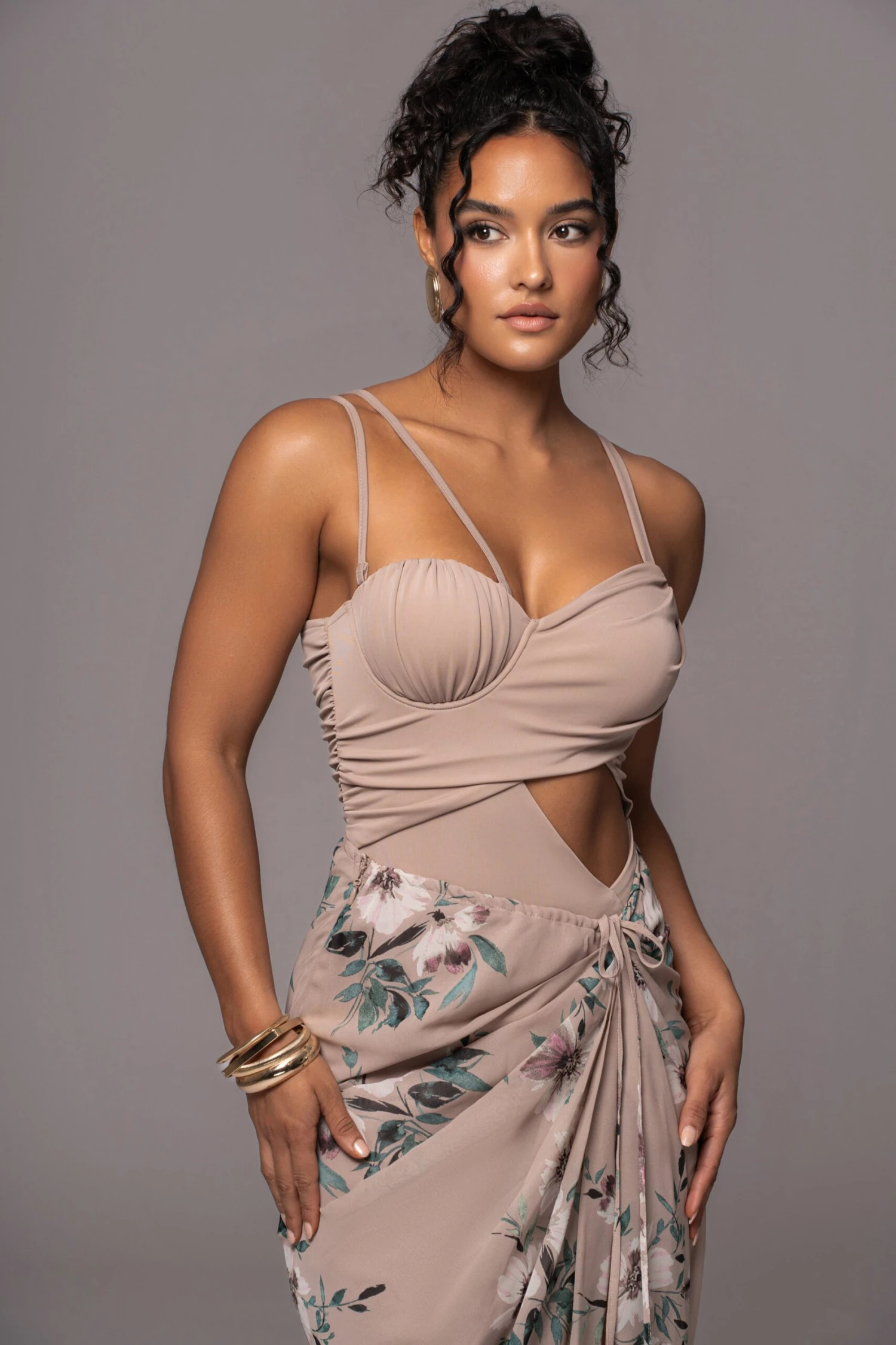 Our Purple Floral Endless Oasis Skirt Set is the set of dreams! Featuring a lovely bodysuit with ruching throughout, a side cutout, adjustable shoulder straps, and a back zipper closure. The matching skirt features a draped design with slit and side zipper closure. Crafted in fresh chiffon, this dress is enriched with a delicate floral pattern, adding a carefree summer vibe. Some stretch. Double lined. Sold as set.