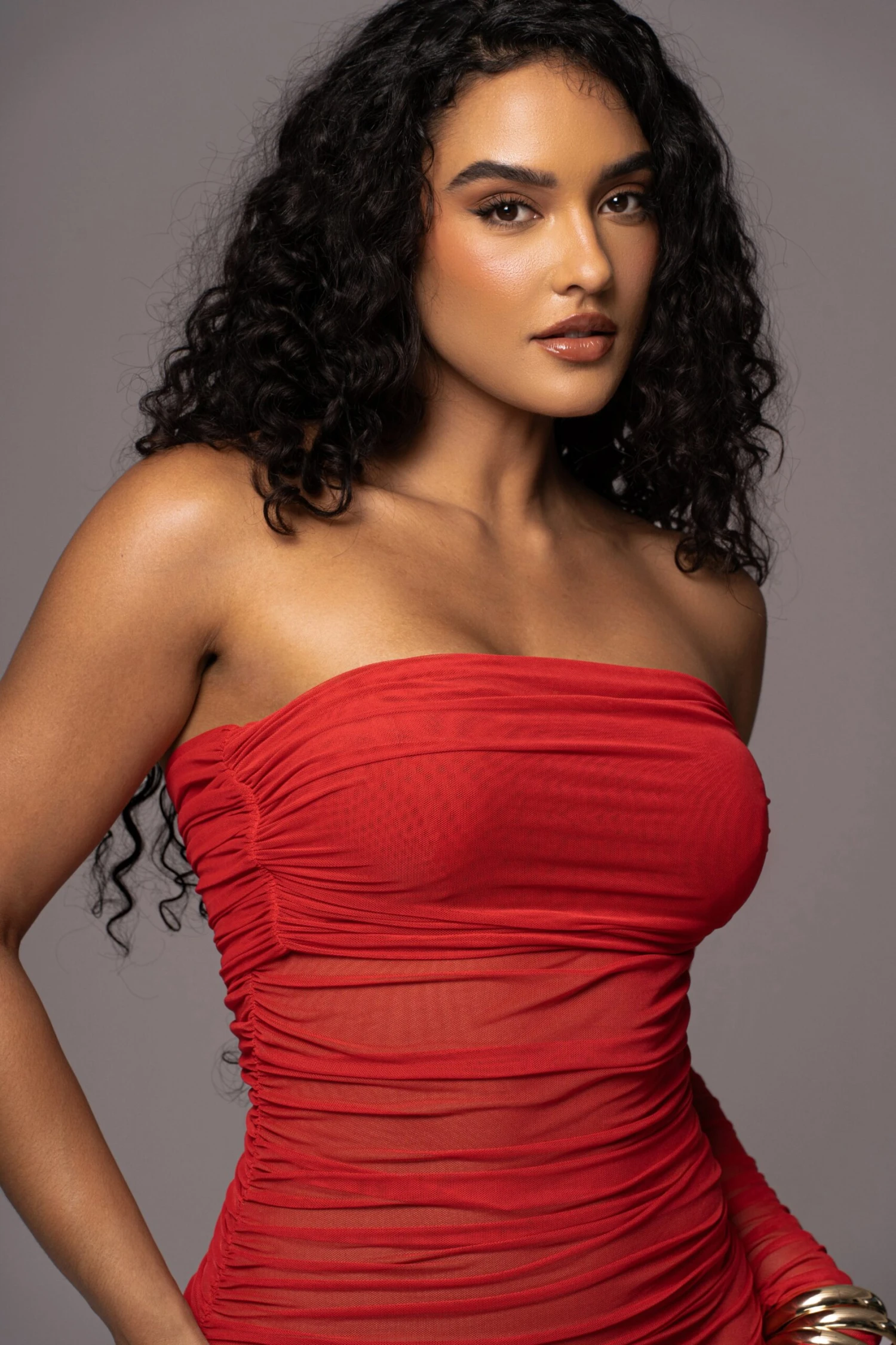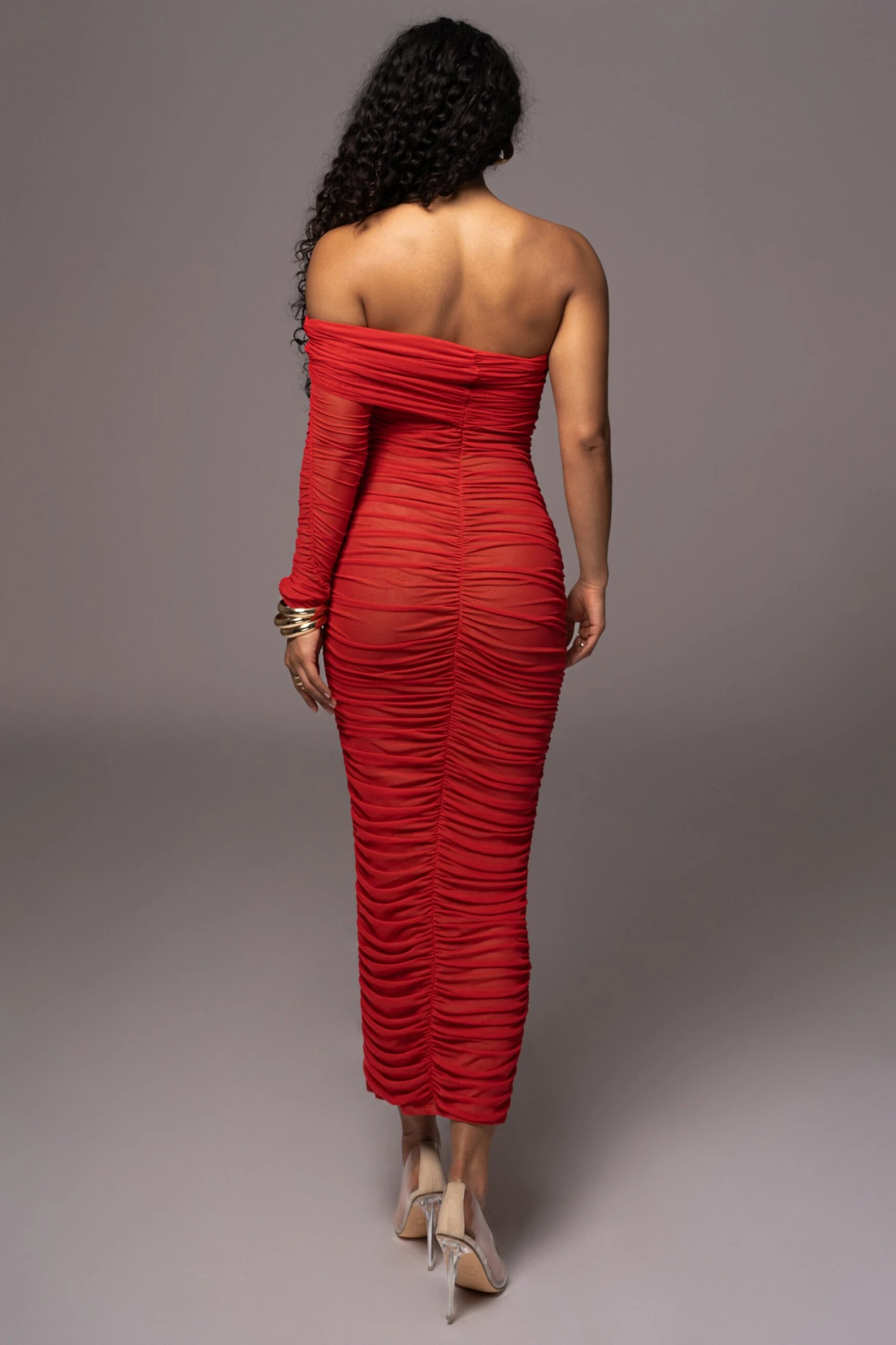 Our Red Denise Ruched Dress is mesh perfection! This modern midi dress features a one shoulder neckline with full arm coverage, a padded bust, and beautiful ruching detail throughout. A curve-hugging silhouette and stylish back slit finish the look! Complete with nude interior lining. Stretchy.