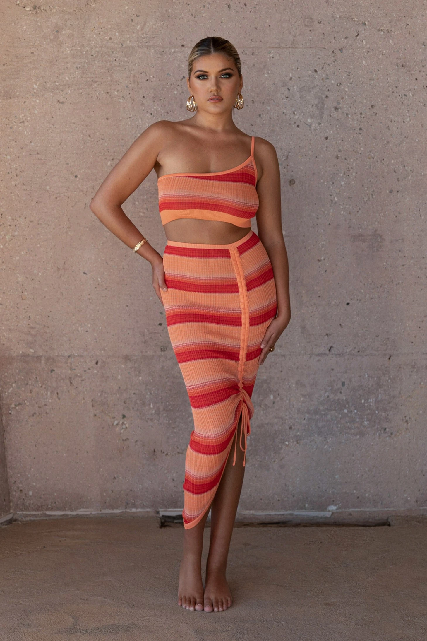 Head out for some fun in the sun with our Red Good Times Crop Top. This trendy lightweight top features a one shoulder neckline with an adjustable strap and cropped hem. A striped pattern throughout adds a playful element in vibrant hues. Pair with our