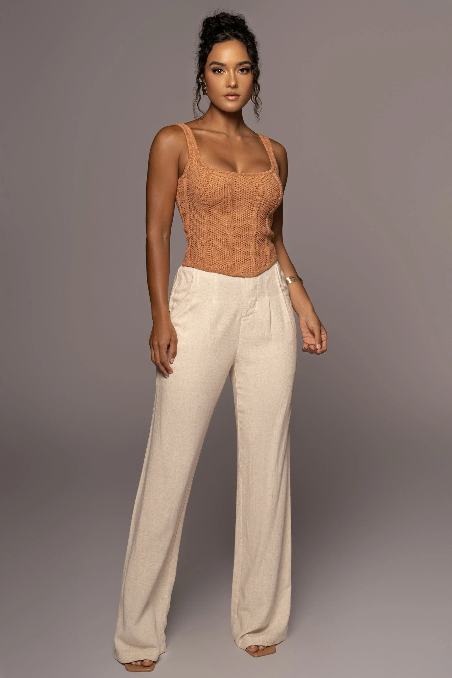 EXCLUSIVELY DESIGNED BY US FOR YOU. Set a coastal vibe with our RUST SHORE THING CROCHET TOP! This crochet knit top features a squared neckline with tank shoulders straps, a ribbed bodice, and back lace up ties. Pair with our