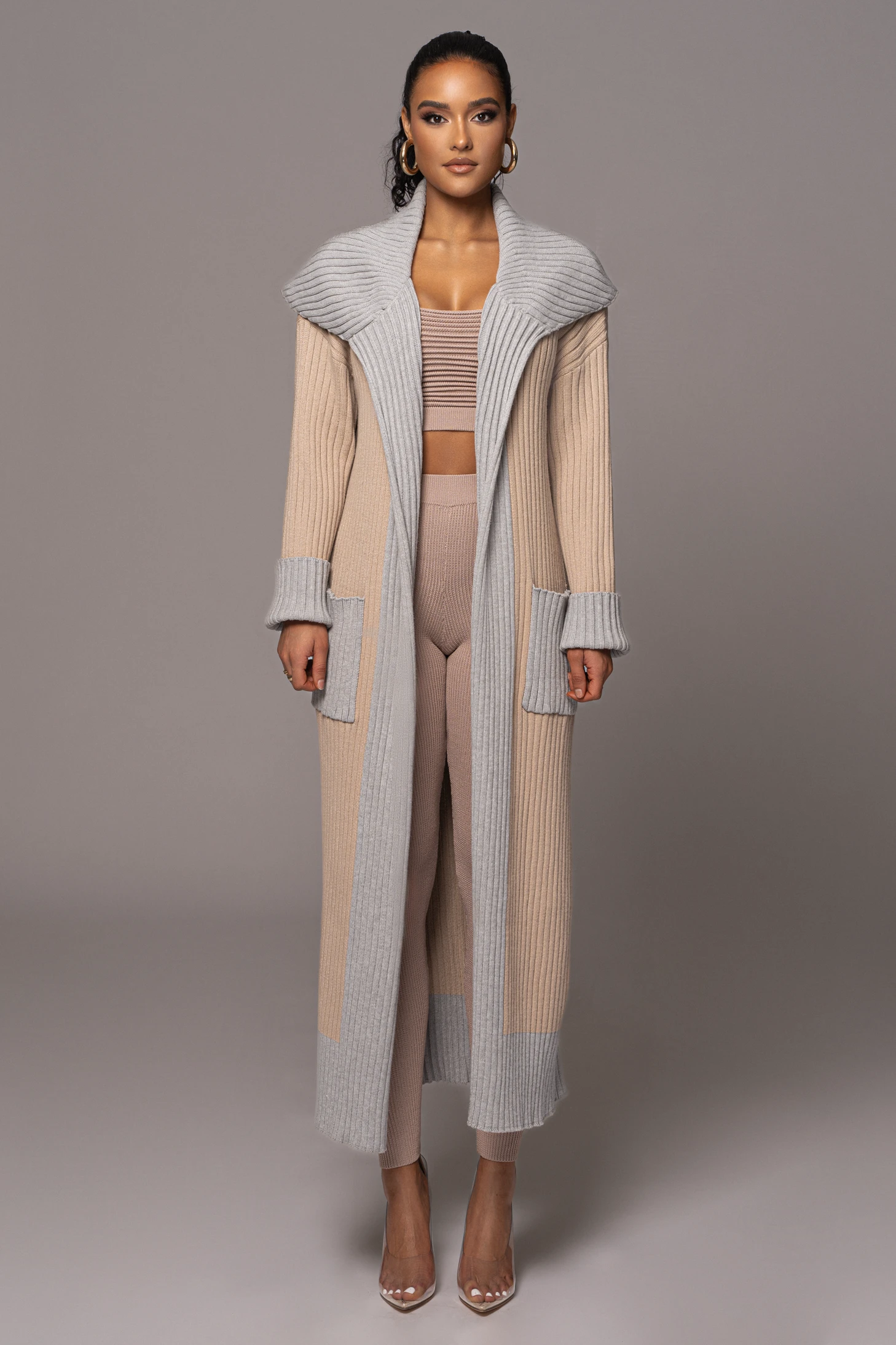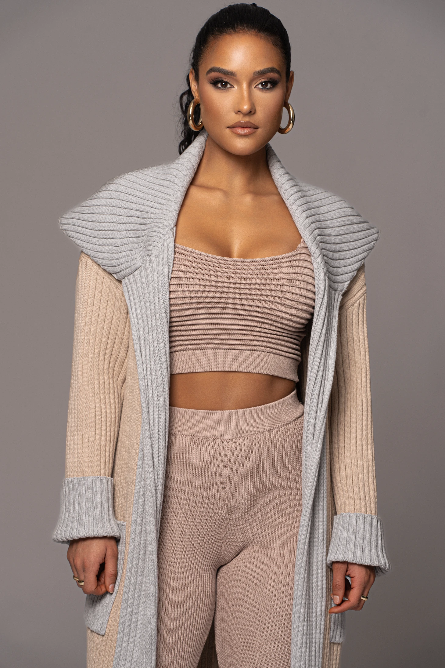 Crafted in classic rib-knit fabrication, our new Sand Carmela Rib Knit Cardigan features a stylish shawl collar lending extra style as an optional scarf. An open-front with long-sleeve arms and a longline hem finish the look. Oversized. Stretchy.