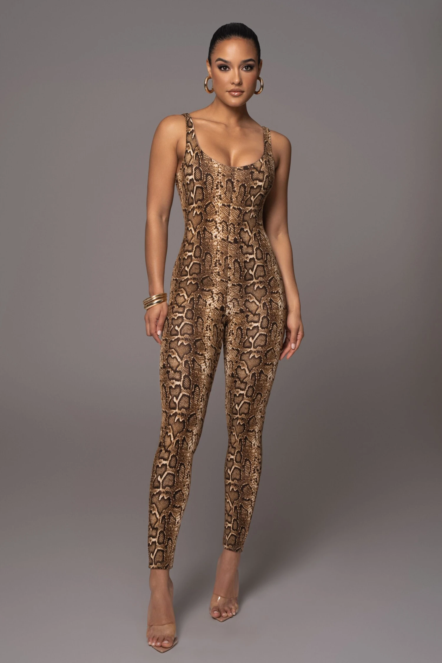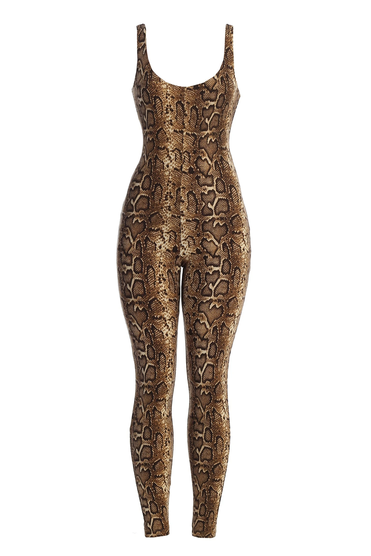 Make an unforgettable impression in the Snakeskin Wild Ones Tank Jumpsuit. This eye-catching jumpsuit features a snakeskin print, u-neckline and double lining for extra comfort. Its form-fitting silhouette and skinny hems flatter any body shape. Stretchy.
