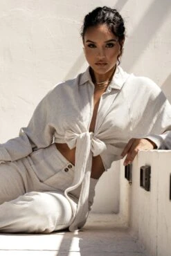The Stone Soho Front Tied Woven Top is a staple piece to style all year round! Featuring a lightweight knit fabric, this long sleeve top comes with a v-neckline formed by a stylish self tie front closure. Designed in a cropped hem with a relaxed fit for ease and comfort. Pair with our