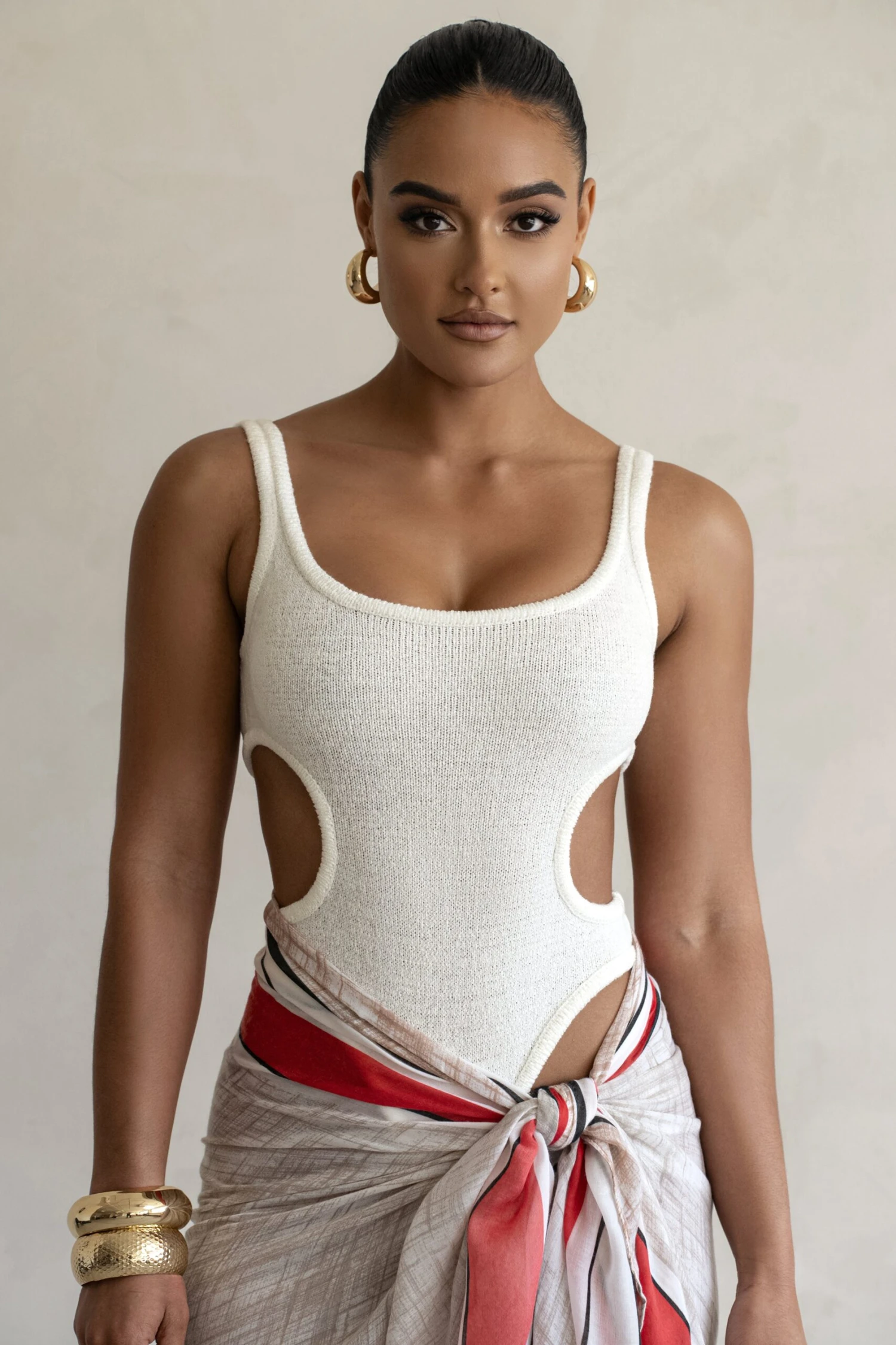 Radiate under the sun in our White Sunset Cut Out Bodysuit. Crafted in breathable knit fabrication, this vacay-ready bodysuit features a scoop neckline with fixed shoulder straps and side cutouts at the waist for a sensual appeal. Complete with a high cut waist, thong-back bottom, and snap closures. Stretchy.